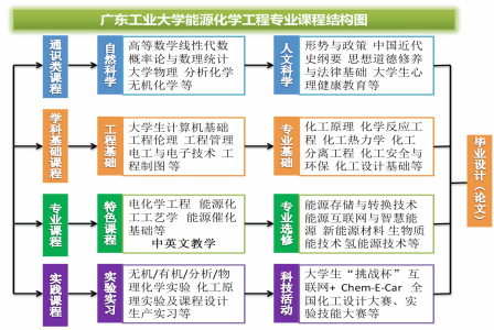 本专业以广东省的能源发展战略为导向,以“符合地区经济建设和社会发展需要;重视工程实践、强调创新能力”为专业培养特色,重点建设电化学储能、生物质能与氢能的研究与应用。本专业构建了“以能源化工专业核心课程为基础的专业方向模块化课程结构”体系,为培养学生科学的思维方法、获取新知识能力或从事其他专业工作打下扎实的基础,并通过设置模块化选修课体系,使学生能承担能源存储与转换、新能源、化工节能等领域的研究、设计、开发、生产及其管理工作。