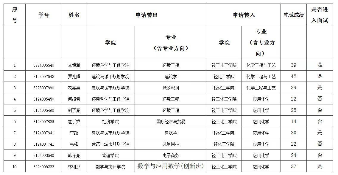 2025年本科生转专业实施方案,目前将笔试成绩以及确定进入面试的名单公布如下,请这些学生按时参加面试: