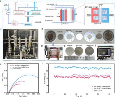 考虑到其高熵特性,将掺杂和缺陷同时引入到NiFeOOH中比较困难,该研究利用高价金属Mo、W等在OER时的热力学不稳定性,引入Mo、Co掺杂,而后Mo在OER过程中原位析出形成金属空位。优化后的Co、Mo-NiFe LDH催化剂作为碱性电解槽阳极催化剂,并使用商业镍电极作为阴极催化剂。实验结果表明,采用优化的双稳压电极的AEM电解槽可以达到工业级电流密度,且能耗低至4.9 kWh m-3 H2。这种双调节NiFe基电极的高OER活性和高耐久性有望成为工业制氢的商用OER电极。