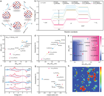 文章首先利用密度泛函理论计算了材料的电子密度、能带结构和中间体吸附能。通过对材料态密度进行分析得到材料的能带结构和带隙,确定材料的金属或半金属以及半导体性质,分析其导电性。计算得到d带中心相对费米能级的位置和反键轨道的填充度,以确定中间体的吸附强度。根据中间体吸附能的线性标度关系(linear scaling relation)确定反应的决速步和每一步的吉布斯自由能变,并通过volcano plot curve和energy profiles验证实验结果。