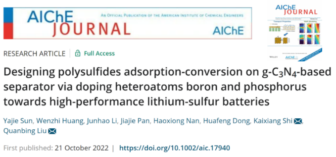 绿色过程团队刘全兵教授在锂硫电池研究领域取得重要进展,题为“Designing polysulfides adsorption-conversion on g-C3N4-based separator via doping heteroatoms boron and phosphorus towards high-performance lithium-sulfur batteries”的研究成果发表在化工领域TOP一期刊AIChE Journal上。该工作以DFT计算为指导,通过设计、构筑杂原子掺杂g-C3N4模型应用于锂硫电池隔膜,为获得高性能锂硫电池提供了新策略。本论文通讯作者刘全兵教授/石凯祥博士后,第一作者硕士研究生孙雅洁,均是拷贝漫画