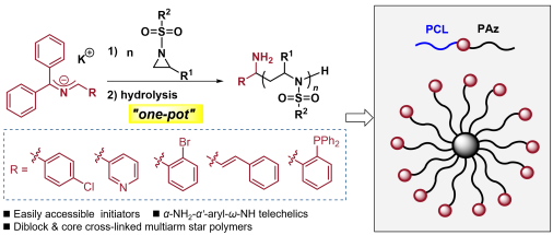 N-磺酰基取代的氮杂环丙烷的活性阴离子开环聚合是合成线性聚乙烯亚胺基高分子材料的重要合成方法,但是该聚合反应的引发剂往往局限于非功能化的N-苄基-磺酰胺,不利于聚合物链末端的功能化或进一步修饰(post-modification)合成嵌段或复杂拓扑结构聚乙烯亚胺基高分子材料。该研究首次采用易于制备的2-氮杂烯丙基阴离子作为引发剂开环聚合N-磺酰基取代的氮杂环丙烷,并且通过“一锅法”进行开环聚合反应和端基亚胺水解反应高效合成了伯胺为端基的聚氮杂环丙烷遥爪聚合物(图1)。合成的聚合产物具有明确的端基,很窄的分散度(Ð< 1.20),且分子量可通过单体与引发剂的比例进行严格控制。动力学研究揭示了其一级反应动力学及分子量可控的“活性”聚合特征。合成的遥爪聚合物的端基具有伯胺基团,可在辛酸亚锡的催化下进一步引发了ε-己内酯的开环聚合制备PAz-b-PCL嵌段聚合物。另外,遥爪聚合物的ω-NH端基也可作为引发基团,通过在膦腈配体t-Bu-P4的催化下与过量的双氮杂环丙烷取代的双酚A交联剂开环聚合合成核交联的多臂星状聚合物。