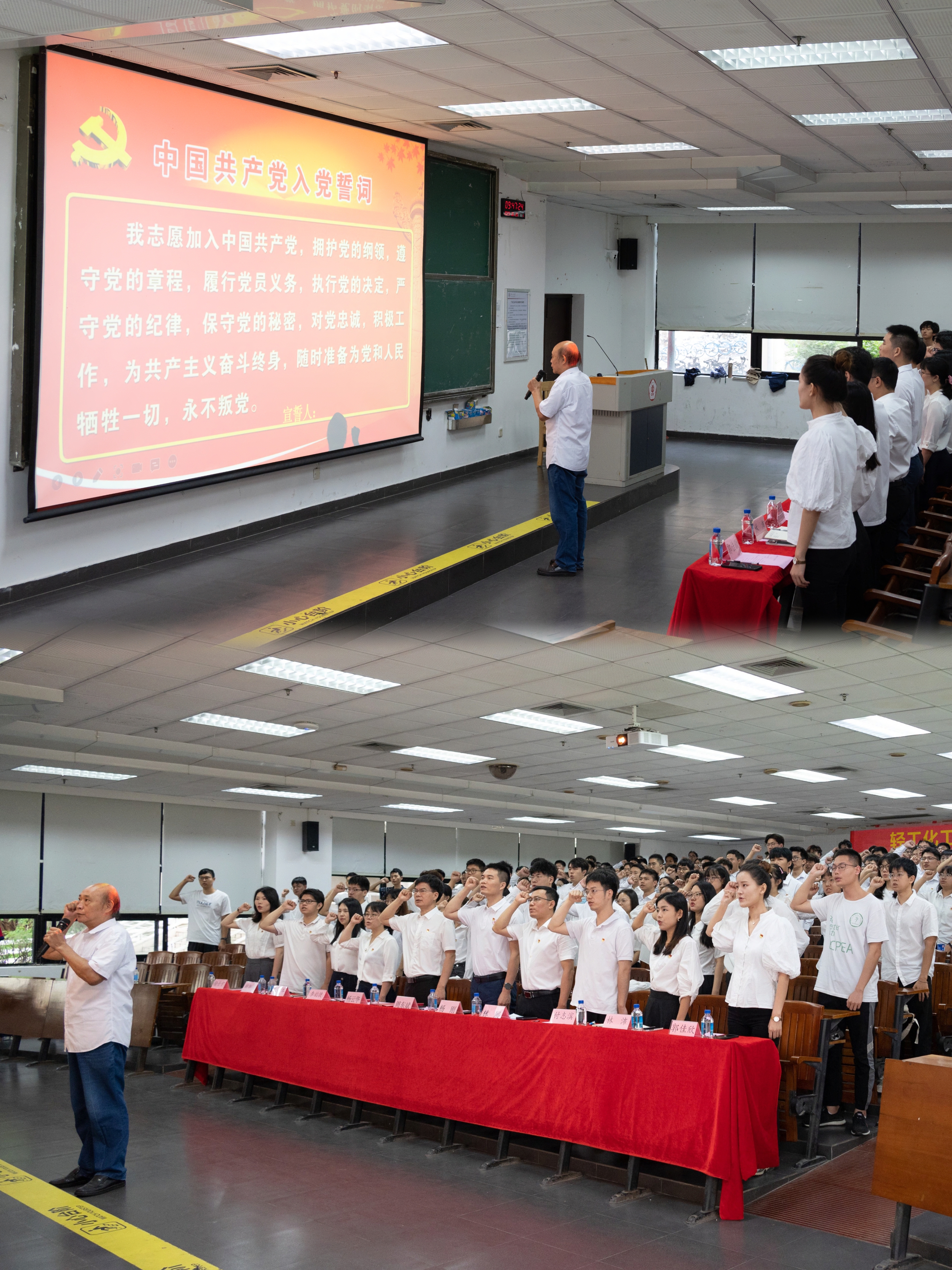 随后,新发展党员代表陈瑶同学发言。她通过讲述自身的入党初心,号召同学们在日常学习和工作中,时刻牢记党员身份,积极发挥党员先锋模范带头作用。毕业生党员代表林康迪同学代表2023届全体毕业生党员向学院和学校表示感谢,他回望自己在广工树理想、磨意志、学知识、拓视野的难忘经历,结合化学化工专业讲述了作为青年大学生党员的初心使命和理想追求,并代表毕业生党员许下庄重承诺:“无论我们身处何方,我们都要牢记入党誓词,锤炼党性,做新时代的奋进者、开拓者、奉献者,继续书写无愧于青春、无愧于国家、无愧于时代的精彩人生,为轻化发展增添光彩,为广工建设贡献力量,为实现中华民族伟大复兴的中国梦而努力奋斗。”