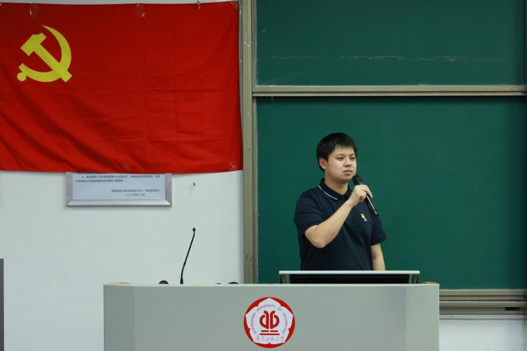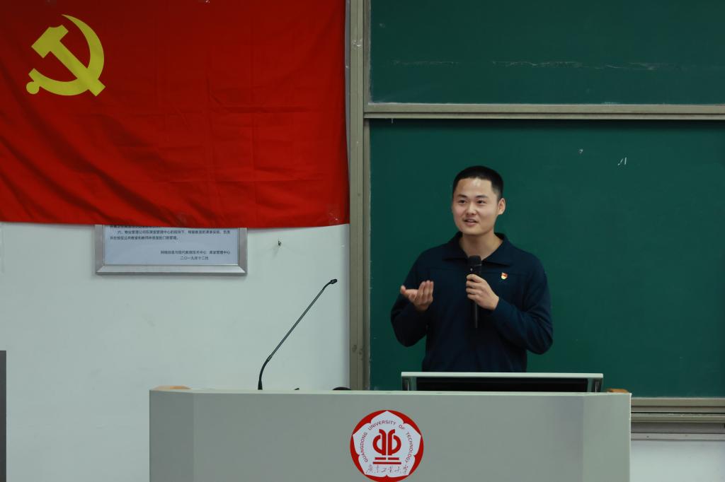 来自化工第一党支部的龙升豪以“参军尽义务,戍边卫国防”为主题,介绍了他从学校到军队,再从军队回到学校的心路历程与现实经历。他表示:“参军对我个人而言是一种成长与磨砺,对我的家庭而言更是代表着一种责任。”在场的听众无不感受到他对保卫祖国的满腔热血,以及对“大家”与“小家”的责任担当。龙升豪以幽默风趣的语言生动地讲述了他的军旅生活,并详细介绍了退伍后如何适应学校生活,如何快速补齐学业差距的经历,勉励在座有条件的同学们积极报名参军入伍。