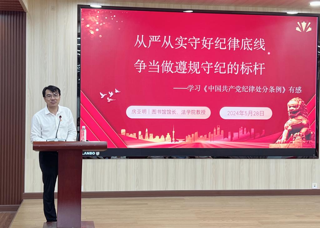 党委于5月28日下午在工三208召开党纪学习教育专题学习会,邀请学校图书馆馆长房亚明教授作党纪学习教育专题辅导报告。会议由学院党委书记周东斌主持,学院全体教师党员、学生党支部书记及博士生党支部支部委员参加会议。