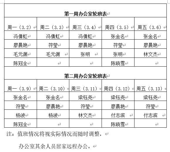 五、院办公室人员上班安排表: