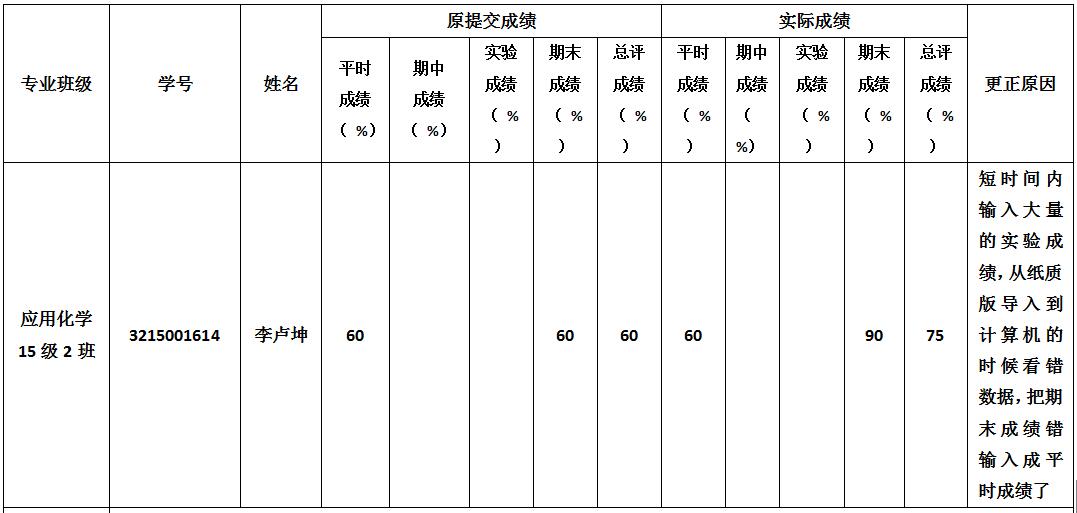 备注:公示期内,如对上述成绩变更有异议,请与学院院办陈老师联系 (电话:39322203,地址:工4-201-3)