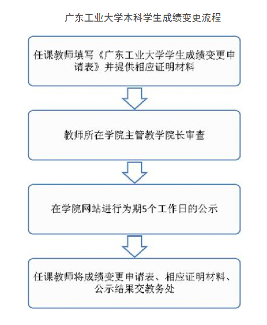 根据《拷贝漫画 理论课程考核管理办法》(广工大教字【2007】15号),学生课程考核成绩已经确定提交后,任课教师无权私自更改。为了保证学生成绩的严肃性,提升教务工作规范化水平,现将本科生成绩变更的流程通知如下:任课教师如确实因评卷记分、成绩录入错误需改动,应由任课教师本人填写《拷贝漫画 学生成绩变更申请表》并提供相应证明材料,经教师所在学院主管教学院长审查后,成绩更改申请需在学院网站进行为期5个工作日的公示,公示期满无异议后,任课教师将成绩变更申请表、相应证明材料、公示结果交教务处,由教务处在教务管理系统中进行处理。