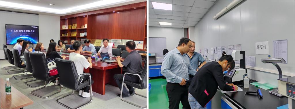 师生首先前往广东轩朗实业有限公司展开调研。在调研交流会上,公司副总经理华路介绍了公司发展历程、主营产品、未来机遇以及面临挑战,并围绕各类光学膜片、光学板材及功能性光学材料的制造技术与师生们进行了交流。紧接着,华路带领师生一行参观了公司研发中心部门,向师生们展示了公司全系列进口精密加工设备和完善的配套测试设施。