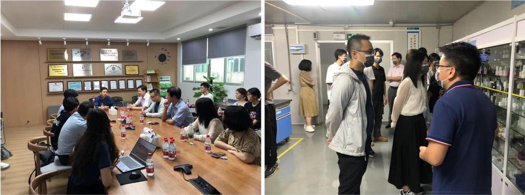 师生来到河源然生新材料有限公司,与公司总工程师邹名超、培训专员李红涛进行了交流学习。在研发中心和生产部门,师生们参观了工业胶粘剂及美甲胶粘剂等全系列胶种的研发、生产、销售全产业链生产研发过程,并与两位负责人在胶粘剂技术研发和生产工艺创新等方面展开了探讨。