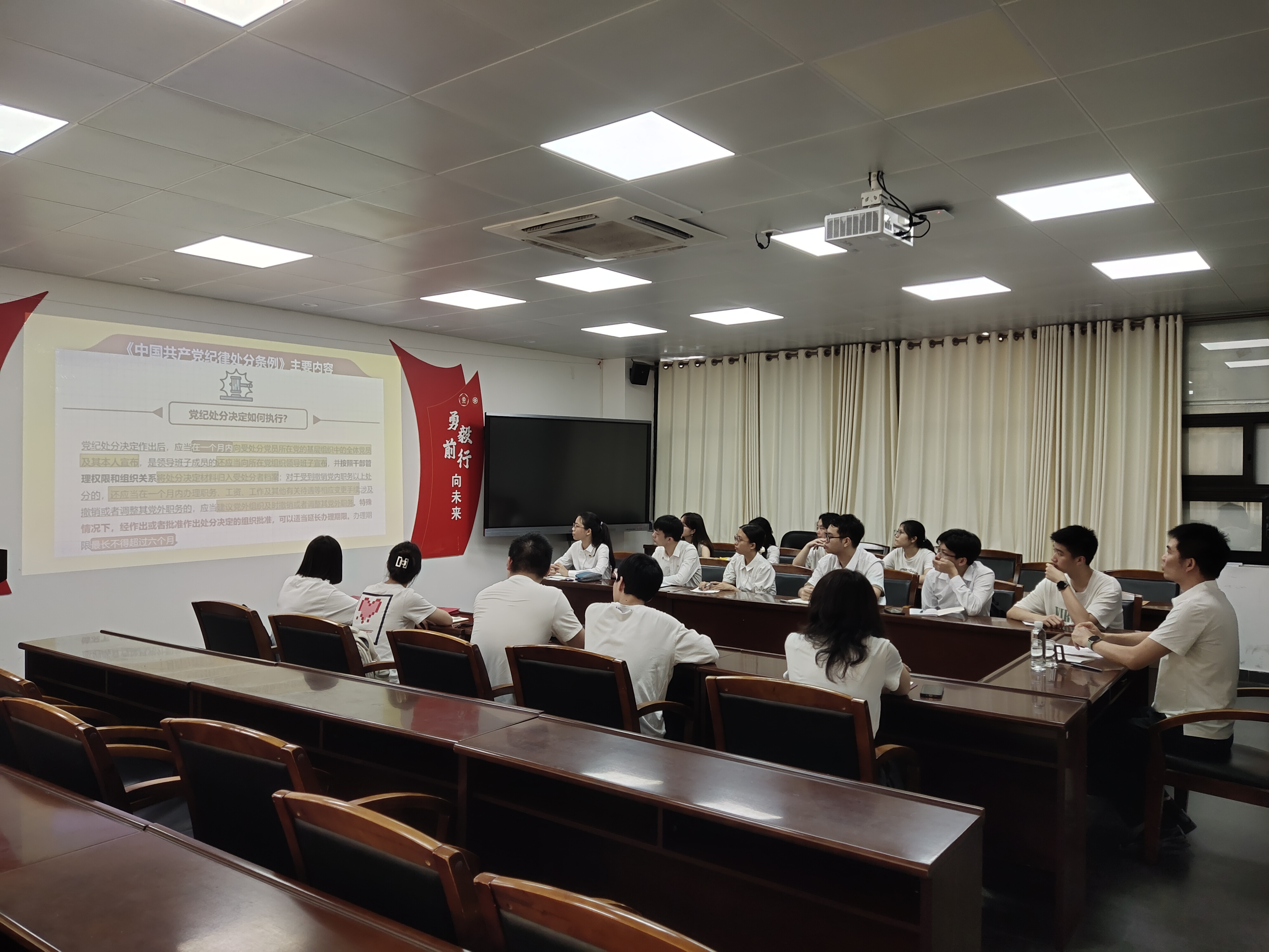 听一堂微党课武装头脑。学院党委副书记杨刚以“微党课”的形式,详细介绍了《中国共产党纪律处分条例》的历次修订情况、主要内容以及新旧条例如何规范使用,引导学生党员主动学纪、知纪、明纪、守纪,不断增强纪律意识,守住纪律底线,提升党性修养。他强调,遵守《中国共产党纪律处分条例》是每一名党员的责任和义务,希望学生党员做到心中有党、心中有责、心中有戒,始终保持共产党员的先进性和纯洁性。