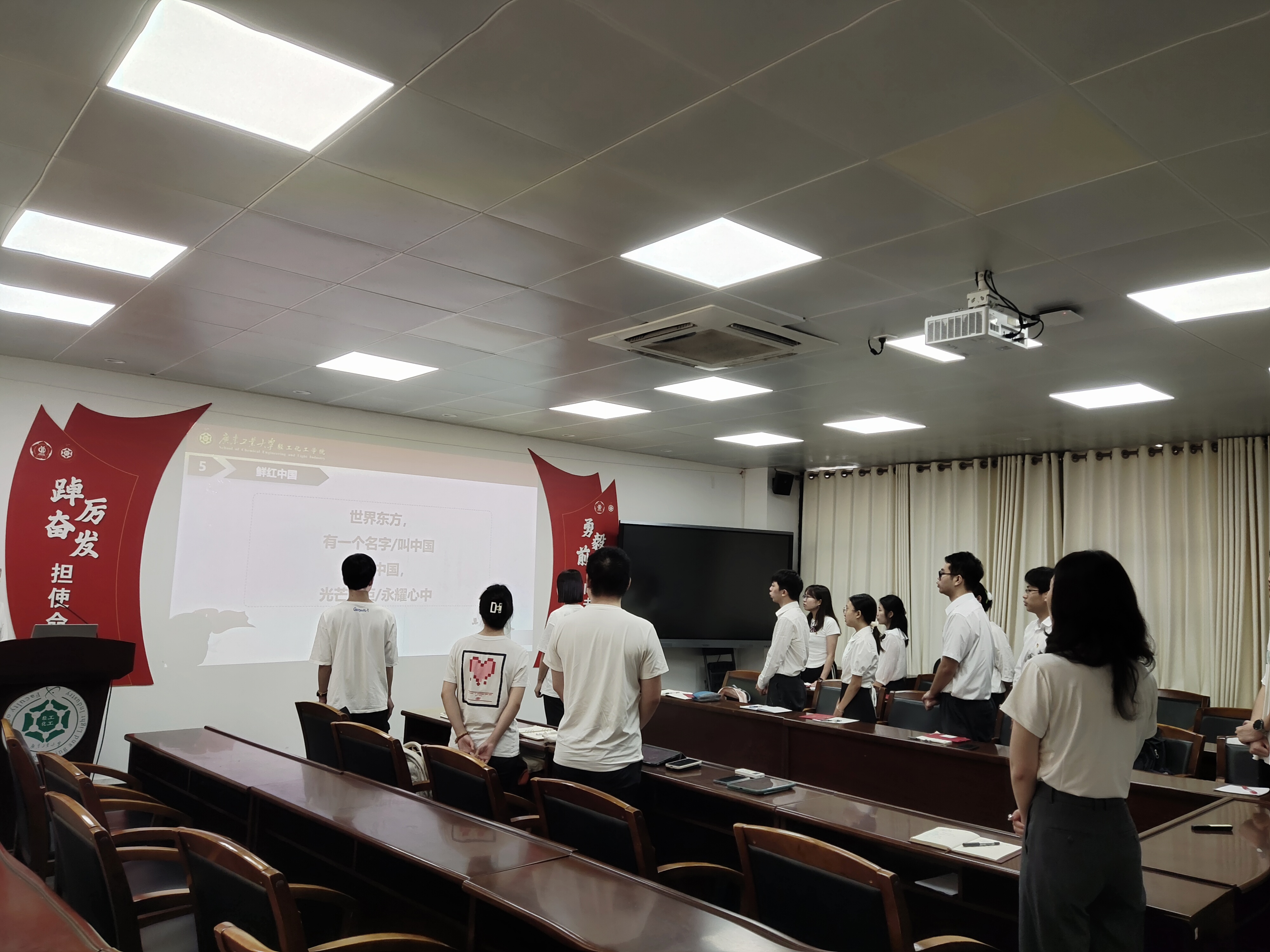 读一首爱国诗词坚定信念。今年是中华人民共和国成立七十五周年,回望来路,苦难铸就辉煌;展望前途,光明引领未来。由叶同欣同学和曾庆彬同学带领支部成员朗诵《鲜红中国》,“世界东方,有一个名字叫中国,鲜红中国,光芒如炬,永耀心中”,支部成员以饱满的热情和强烈的情感,歌颂出对祖国母亲的爱,激励着支部成员奋勇向前,为党和国家作出贡献。