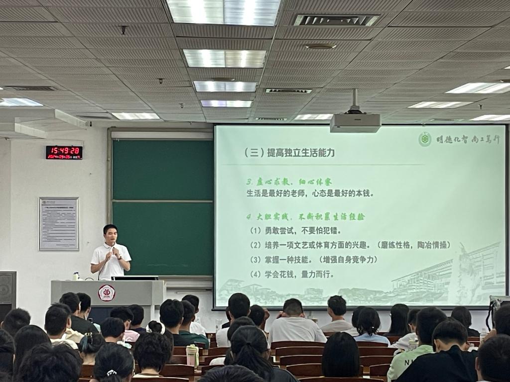为了帮助新入学的同学们更好地适应大学生活,明确学习目标,学院党委副书记杨刚老师在新生入学教育周作了《如何读大学》主题分享。杨刚副书记从什么是大学、为什么读大学、如何读大学三个方面与新生们进行分享与交流。在“什么是大学”部分,杨老师引经据典,结合自身经历,向同学们介绍了大学生活是怎么样的。紧接着,他围绕自己、同学、修养、独立思考能力、知识、学历及文凭、人际交往能力、见识等八个方面,分享了他对“为什么读大学”的思考。随后,杨老师围绕进入大学后面临的新变化、树立新的学习理论、提高独立生活能力、合理安排课余生活等四个方面,详细讲述了他对如何读大学的思考和感悟。通过“你准备度过一个怎样的大学四年?”问答互动,并带领同学们开展“攀撑宣言”入学宣誓,他引导新生们做到自觉自律、自省自强、自我认同,走上成长加速度曲线,努力成长为有理想、敢担当、能吃苦、肯奋斗的新时代好青年。