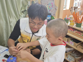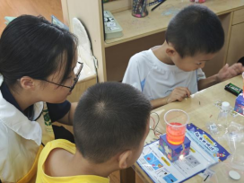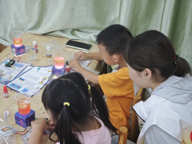 课程后半段,12名志愿者化身“科学助手”,协助小朋友开展实验。志愿者们手把手指导小朋友们连接导线、安装电池,提醒他们小心地倒入水、色素和油,一遍遍耐心地提醒“不能碰嘴”。放入泡腾片后,看到瓶中红色“熔岩”上下翻腾,小朋友们纷纷发出欢呼“我的灯亮啦!”。志愿者们耐心解答疑问、纠正操作,确保每位小朋友的熔岩灯都“亮起来”。