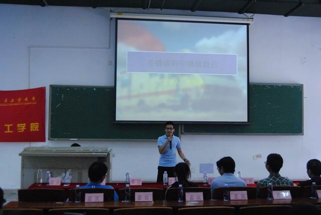 会议开始,主持人对“筑梦实验室”进行了简单介绍,并由林焕章老师做创新创业训练申报动员讲话。林老师从学校学院的措施保障、经费配套、人员组成、奖励措施、活动意义、申报流程等方面向同学们做了详细的介绍,并鼓励同学们积极投入创新创业训练的申报中,走进实验室,走入社会,共同营造创新创业的氛围。接着,四支省赛队伍代表跟大家分享了自己参加挑战杯及实验创新、获奖历程,为现场同学们传授了如何进入实验室,开展课题研究,申报挑战杯等经验。并与同学们进行了互动交流。