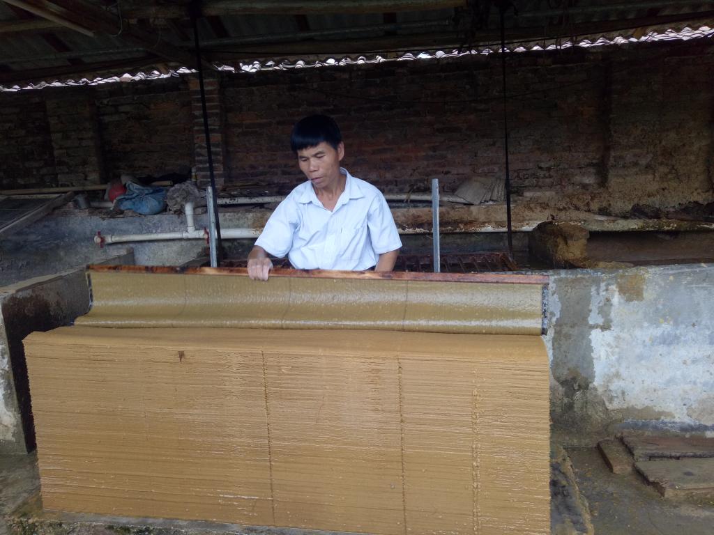 到达邓村后,我们受到了当地村委书记等工作人员的热情欢迎,他向我们介绍了邓村和古法造纸术的基本情况;随后,我们在村委妇女主任的亲切指引下,一同参观了附近一家规模较大的手工古法造纸厂。当时,造纸厂有两个师傅正在抄纸,这道工序看似简单,实则非常考验手艺,师傅告诉我们“轻荡则薄,重荡则厚”,并指导队员们体验了一下这道抄纸工序。造纸厂四处挂满了需要晾晒的纸张,这些纸将被销往全国各地甚至海外(主要为东南亚地区),主要用于祭祀或祭祖。参观完造纸厂后,队伍分成三组,分别对邓村手工纸厂工匠、村民和游客进行访谈和问卷调查。