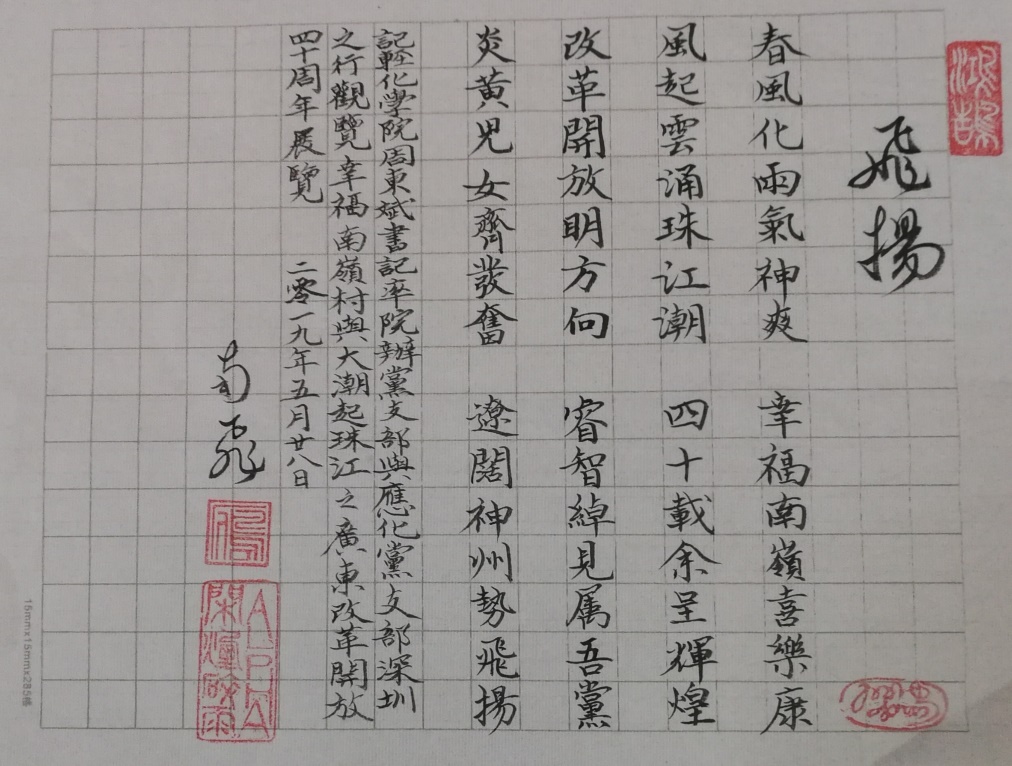 通过本次文化考察和参观学习活动,有助于加深党员同志们对改革开放伟大里程碑意义的认识,进一步领会习近平总书记视察广东重要讲话的精神实质和丰富内涵。同志们纷纷表示,改革开放给社会带来了飞速发展,只有重温历史,才知道前行的不易,与历史前行,才能见证时代的伟大,我们都应该珍惜现在,珍惜生活,更要牢记使命,传承和发扬开拓创新、敢为人先、勇立潮头的改革开放精神,立足本职岗位,砥砺前行,在教学、科研工作上做出更好的突破!支部老党员阎雁教授还为本次“改革开放”之旅写下了感想。