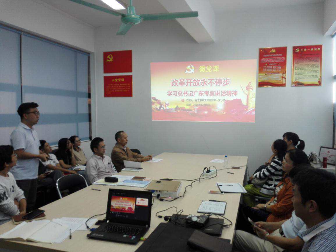 首先开展的学习会,党支部第一党小组以“学习贯彻习近平总书记视察广东重要讲话精神”为主题,传达学习习近平总书记视察广东重要讲话精神,第一期专题“微党课”由董飞飞老师讲授。董老师从“改革开放永不停步”为序,向支部成员详细讲述了习近平总书记于10月22日至25日在广东考察时所作的重要指示。习近平总书记充分肯定广东工作,高度评价改革开放40年广东取得的成绩和创造的经验,要求广东高举新时代改革开放旗帜,以更坚定的信心、更有力的措施把改革开放不断推向深入。微党课围绕“新宣示、新提法、新要求”三方面传达领会习近平总书记视察广东重要讲话的丰富内涵和精神实质。习近平总书记对广东深化改革开放、推动高质量发展、提高发展平衡性和协调性、加强党的领导和党的建设四个方面提出了明确要求,为广东新时代改革开放再出发进一步指明了前进方向。微党课最后梳理的习近平总书记10句话谈改革开放再次宣示了“改革开放永不停步”的决心和信念。全体党员聚精会神地听取报告,对习近平总书记心系广东、寄望广东的情怀深受鼓舞,纷纷表示要以习近平总书记视察广东重要讲话精神统一思想、指导实践、引领发展。