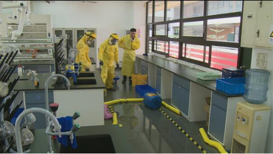郝志峰副院长、蔡晓兰老师及9名研究生在工学四号馆315实验室对有机废液泄露后如何安全、迅速进行应急处理进行了模拟演练。