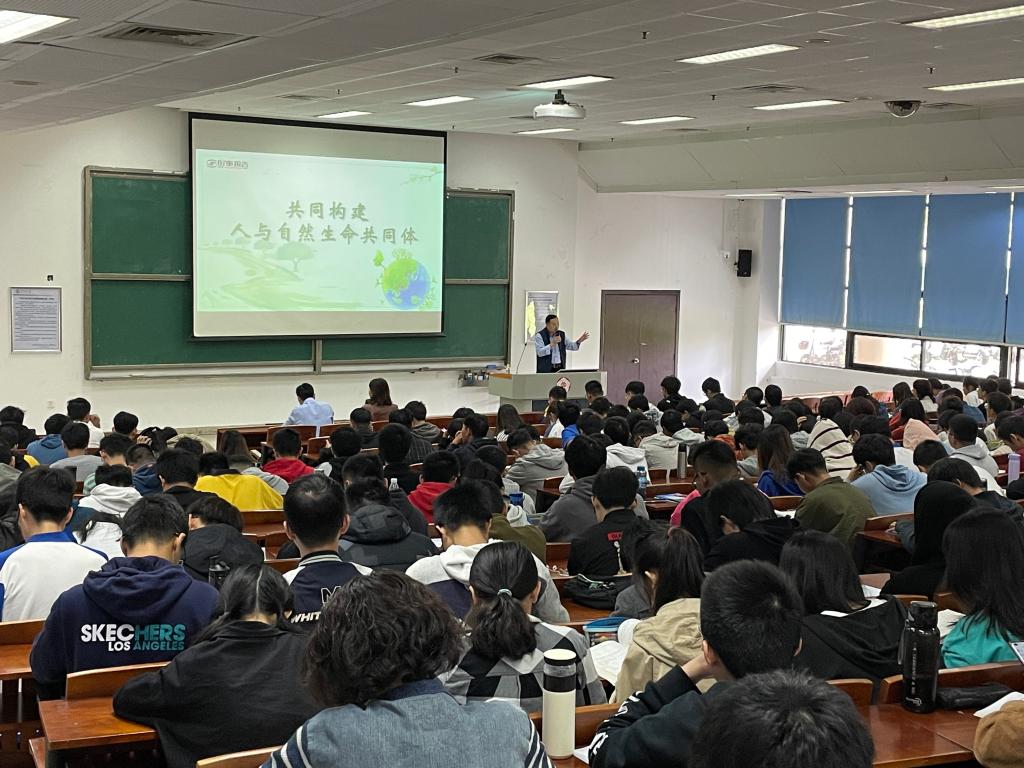 余林教授结合自身专业背景、研究领域及社会现状,依托实际案例围绕《共同构建人与自然生命共同体》主题开讲,从物种的多样性以点带面地介绍全球环境治理面临挑战的“现实之困”,从环境污染和能源危机由小及大地解读推动构建人与自然生命共同体的“中国方案”,最后结合国家实现“碳达峰”、“碳中和”目标及我校发展规划深入浅出地诠释中国勇做全球环境治理行动派的“中国担当”。余林副校长还通过凝聚着中国古代劳动人民勤劳、勇敢和智慧结晶的大型生态水利工程都江堰阐述人与自然的和谐共生。他希望新时代的青年化工人,能有坚持建设生态文明的大局观,不断提升自身本领,以实际行动为构建人与自然生命共同体作出应有的贡献。