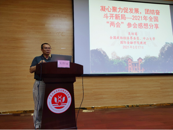 3月17日,学院党委邀请全国政协委员、中山大学国际金融学院教授、企业国际化研究中心主任吴培冠教授在学校科技南楼学术报告厅以“凝心聚力促发展,团结奋斗开新局”为主题作“两会”精神学习专题分享。学院党委委员、教工、学生党员代表、积极分子200余人参加本次活动。报告会由学院党委书记周东斌主持。