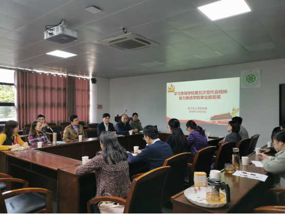 周东斌同志以“学习贯彻学校第五次党代会精神,奋力推进学院事业新发展”为主题传达了学校党委书记胡钦太同志在第五次党代会的讲话精神,要求大家做到“三知道一明确”:一是知道学校过去八年所取得的成就和经验,二是知道学校现在面临的形势和机遇,三是知道学校未来发展的目标和任务,从而要明确自己肩上的责任,要结合自己部门的工作任务制定路线图、时间表,抓住重点,统筹推进。会议号召全院师生要进一步深入学习领会好学校第五次党代会精神,以实际行动为党代会提出的奋斗目标贡献学院力量。