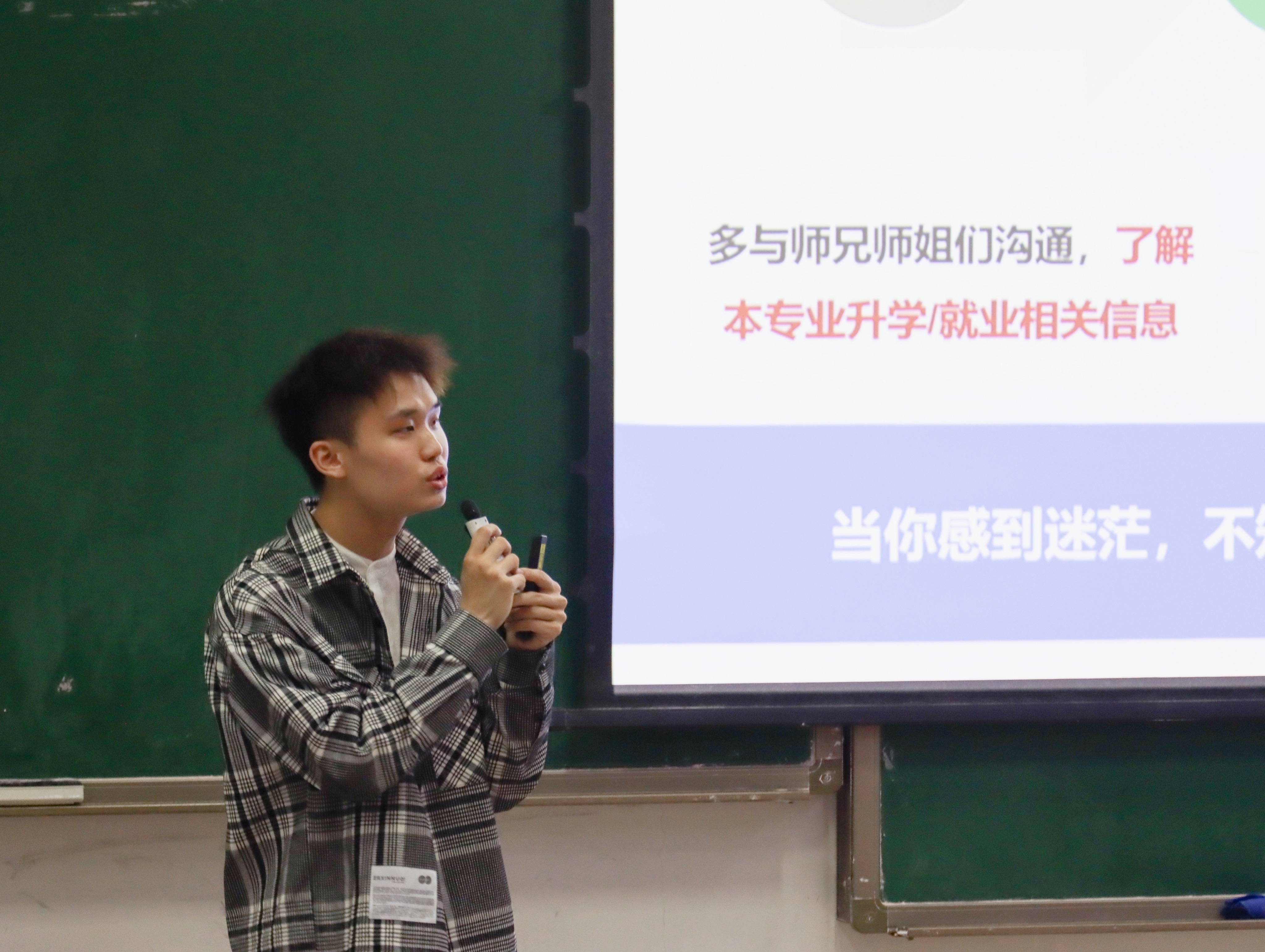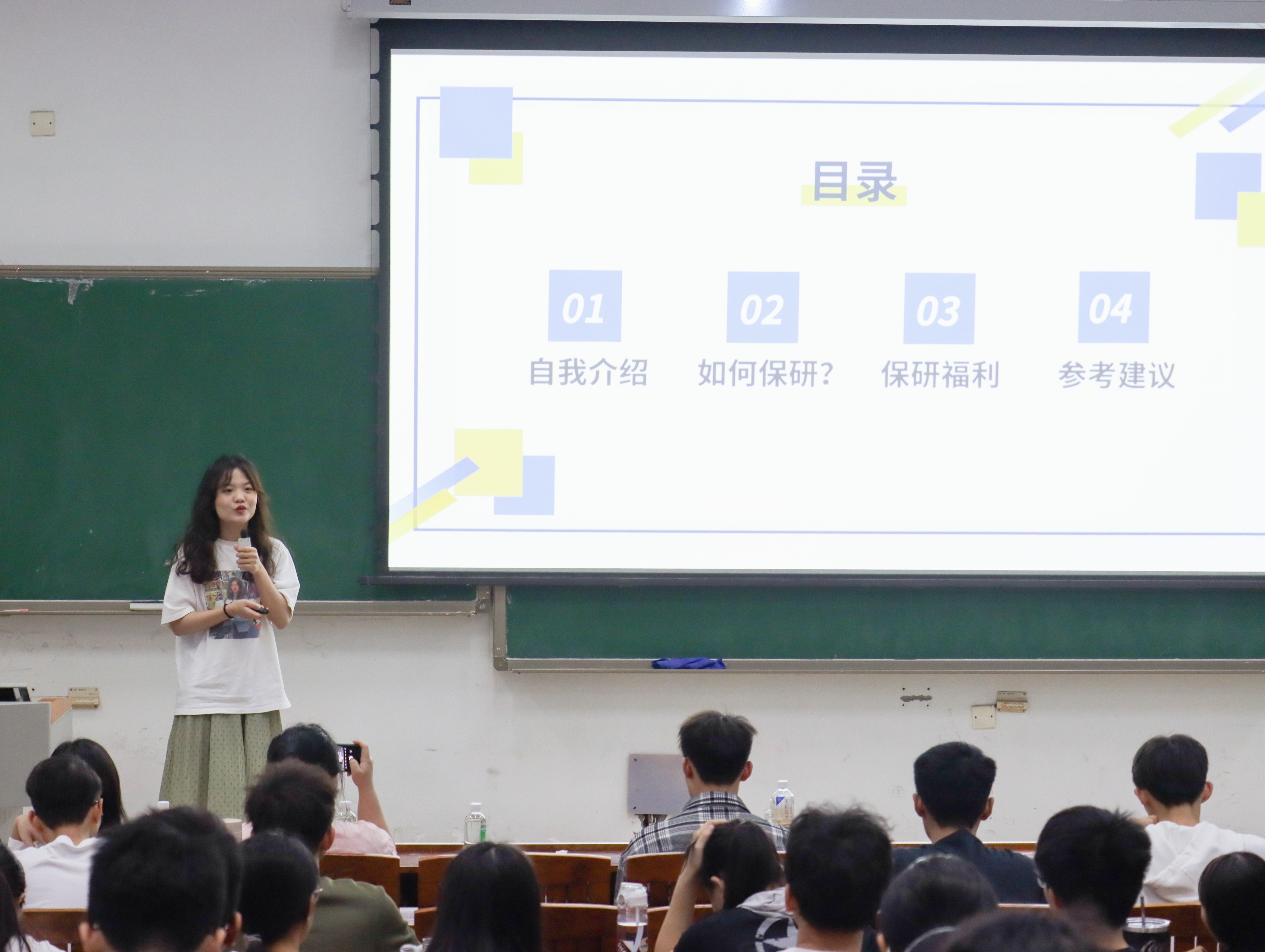 丁婷同学则从前期准备及预推免准备等方面作了详尽的介绍与分析,向同学们推荐了选择好的学习环境、巧用思维导图做笔记、到空旷的地方背书等一些常用的学习方法。她建议同学们尽早准备英语自我介绍在面试中大胆展示自我,并以自身经历鼓励同学们,若没有竞赛经历,只要认真努力地学习,也有机会获取保研资格。