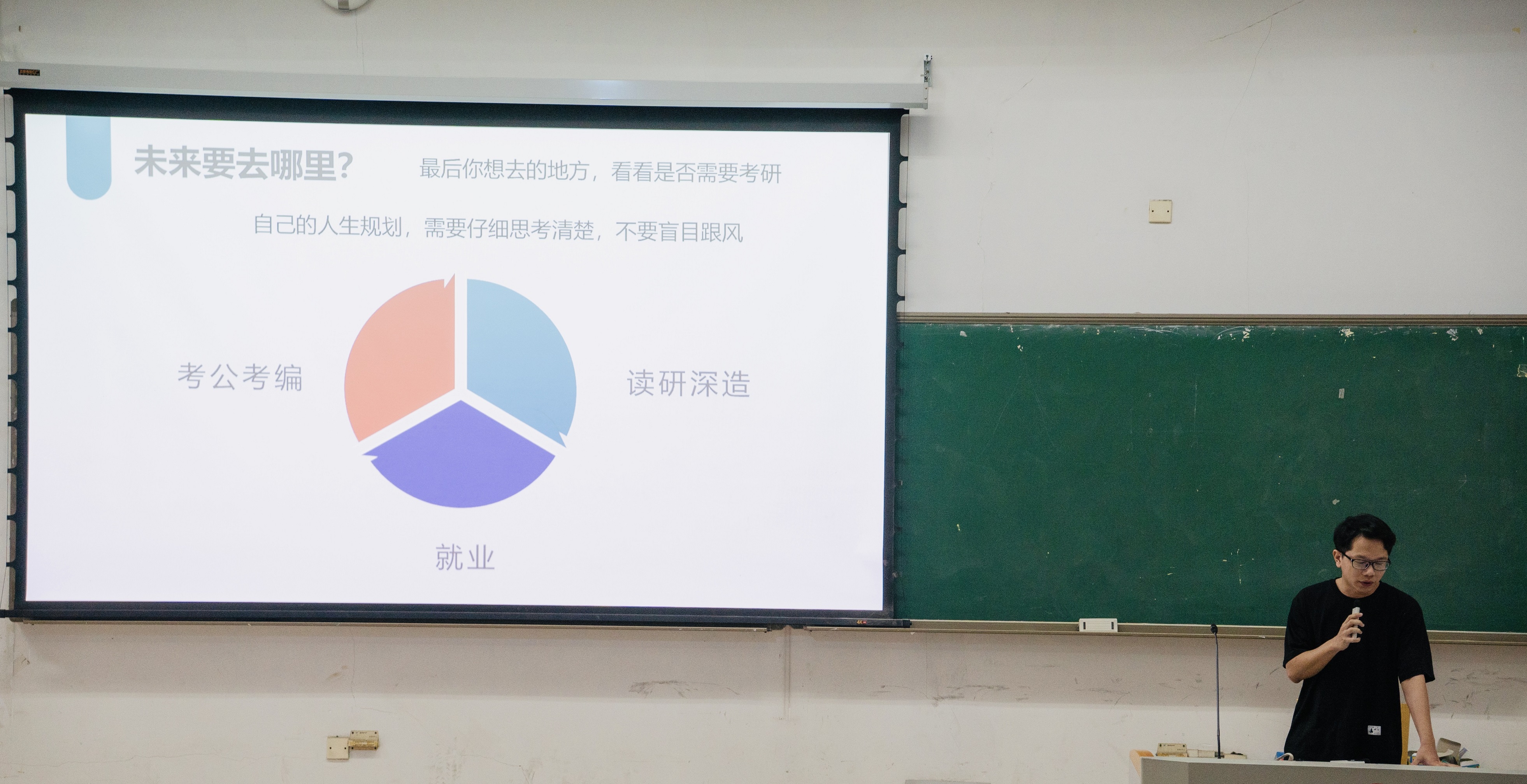 马健辉师兄从考研报考人数变化谈起,通过分析近两年学硕与专硕录取分数线变化帮助大家建立对考研形式的认识;并根据自己的实际经验推荐了一些复习参考书目和时间安排的建议。 “无论你们是否决定考研,都一定要有清晰的人生道路规划,并且做到意志坚定、踏踏实实的学习,不要囫囵吞枣;考研就是考心态,拥有一个稳定的情绪和及时排解不良情绪的能力是考研成功的秘诀。”他这样鼓励师弟师妹们。