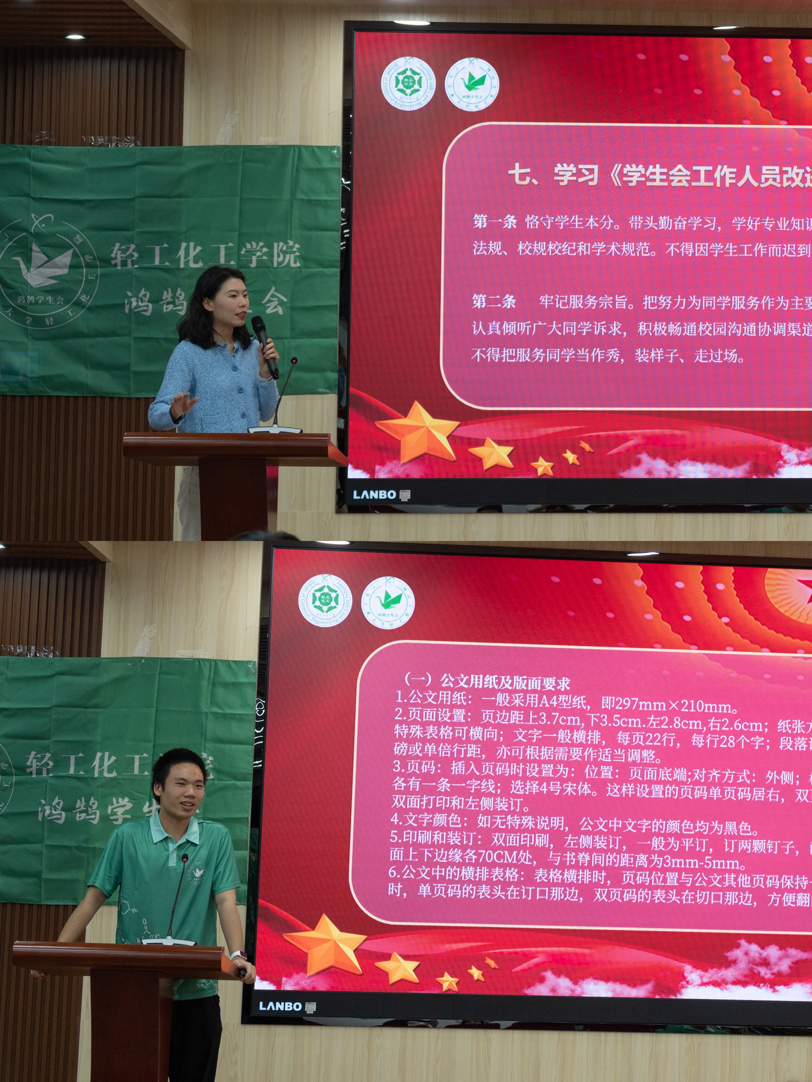 学生会秘书长徐丹宁、学生会主席团成员周涌兴对全体学生会成员进行了《学生会工作人员改进作风若干规定》、公文写作等学生骨干业务能力主题培训班委培训,引导学生骨干培养求真务实,开拓进取的精神,加强自身能力素质的提升,充分发挥模范带头作用