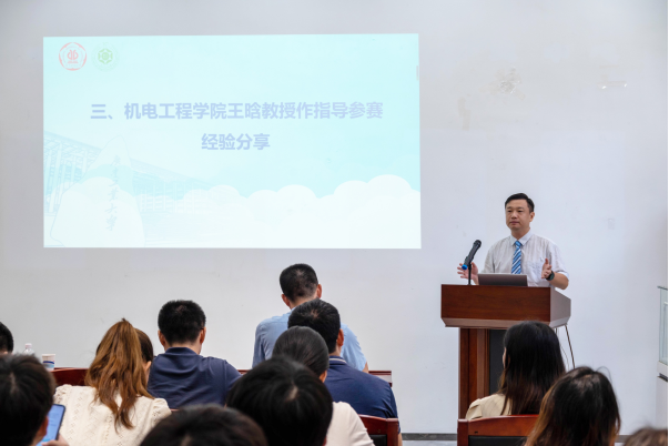 机电工程学院王晗教授结合自己多年来指导学生参赛的亲身经历进行了经验分享。他建议老师们首先要做到三个不”:科研行动不落单、科研目标不攀比、竞赛过程不着急,参赛过程中做到三个固定”:竞赛团队人员固定、场地固定和时间固定,积极引导学生做到“三个清楚”:清楚自身能力、清楚团队定位、清楚个人目标,提醒师生们做到“三个联系”:加强学院间的联系、与辅导员的联系、与校团委老师的联系。他鼓励师生们锚定参赛目标,熟悉竞赛规则,持续努力,通力合作,一定能达成预期目标
