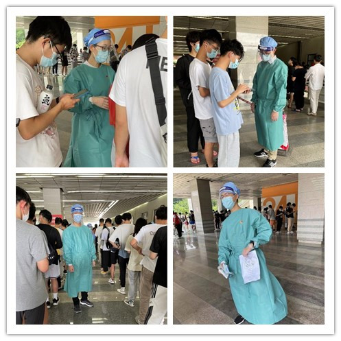 请同学们出示健康码,提前扫码准备核酸码,戴好口罩,有序排队……”图书馆架空层核酸检测点工作现场,除了我校的学生志愿者,也有我们应化系教师党员志愿者的身影。为了保障师生顺利、高效地完成检测,配合医务人员精准取样,党员教师志愿者们耐心地做好现场秩序维护和服务引导,逐一查验健康码,引导核酸码的填写并合理分流等工作。在30度以上的高温下身穿全套防护装备,且连续工作多个小时,实在是一次难忘的体验。经过医护工作者、学校工作人员及师生志愿者的并肩作战,学校大规模核酸检测实现了高效、有序地运作。
