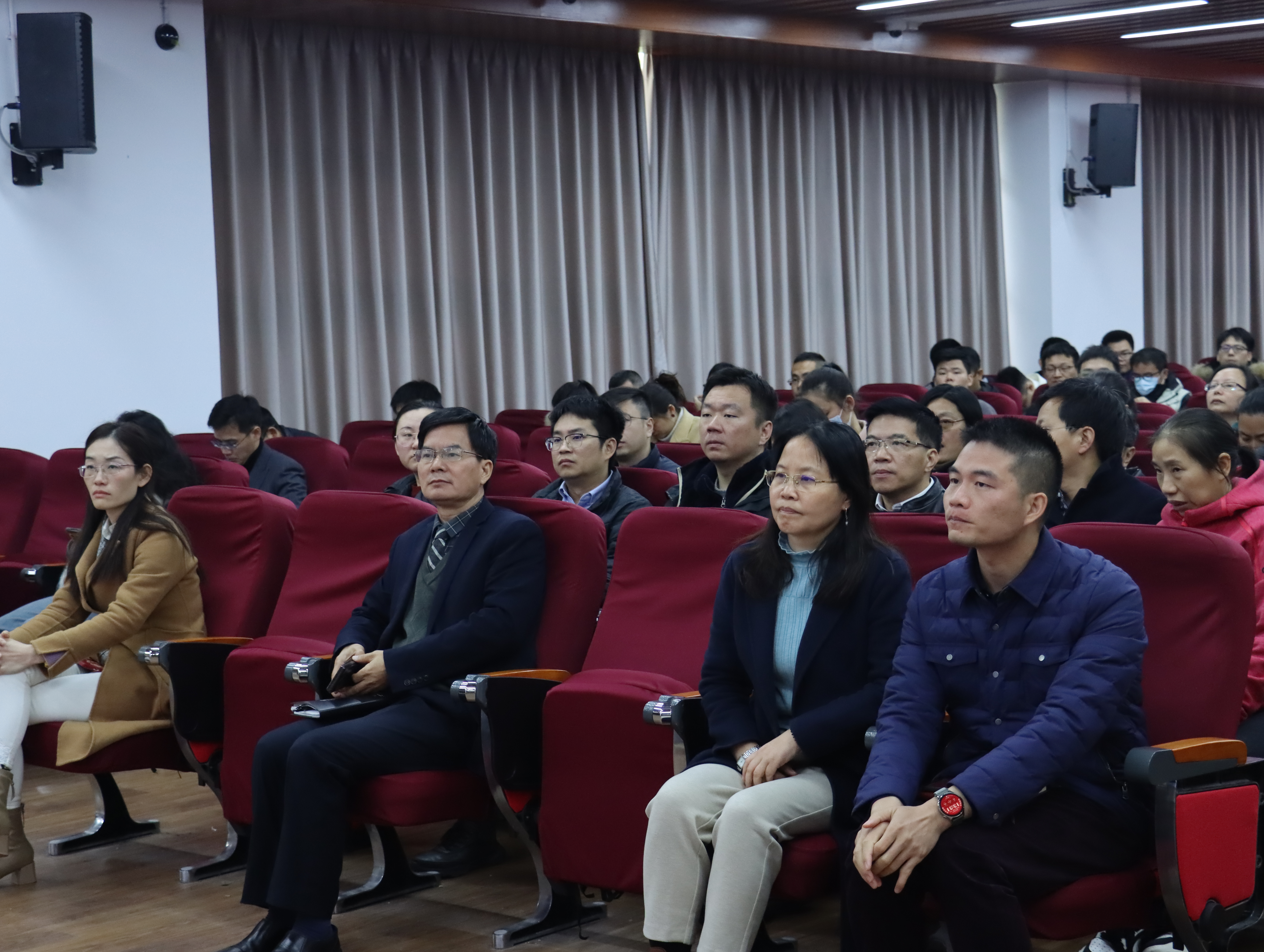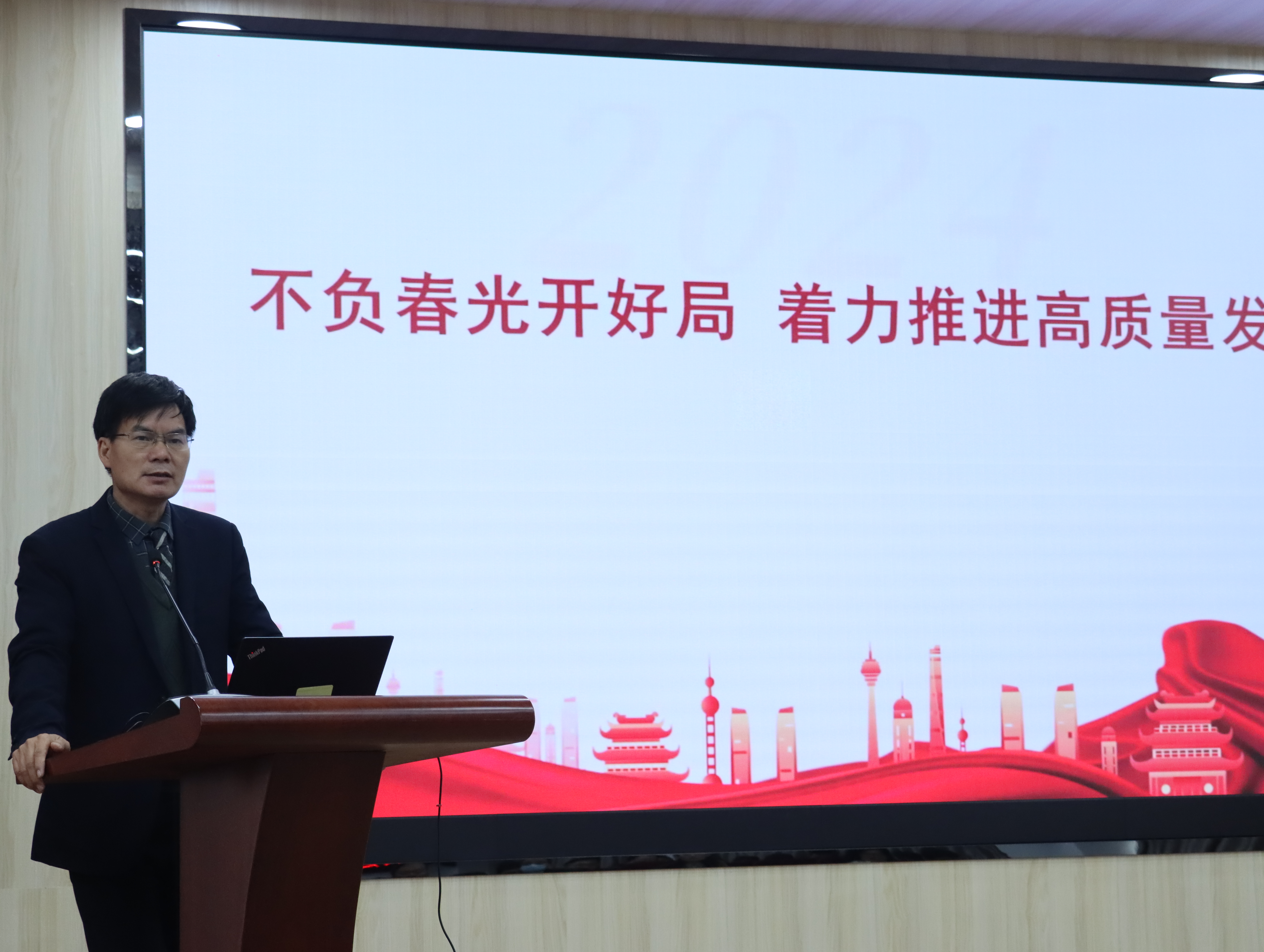学院党委书记周东斌代表学院领导班子向全院教职工致以新春祝福!他以“不负春光开好局,着力推进高质量发展”为题,向全体教职工传达了2024年学校工作会议精神,带领大家学习胡钦太书记和邱学青校长在会上作的工作报告精神,强调全体教职工要做到“四个坚持”,夯实“七大力量”,共同凝聚“冲一流”建设的强大合力。他通报了寒假期间学院申报材料与化工专业博士点工作情况,高度肯定了学院相关教师在寒假期间无私奉献、拼搏进取的精神。他要求,在新的一年,全体教职工要“锚定一流 感恩奋进”,深入学习贯彻习近平新时代中国特色社会主义思想,加强师德师风建设,筑牢政治忠诚,落实立德树人根本任务,坚持以培养拔尖创新人才为核心,充分发挥各方力量做好学科与平台建设,开展有组织的科研,树牢安全意识和底线思维,坚持发展和安全并重,实现高质量发展和高水平安全的良性互动。