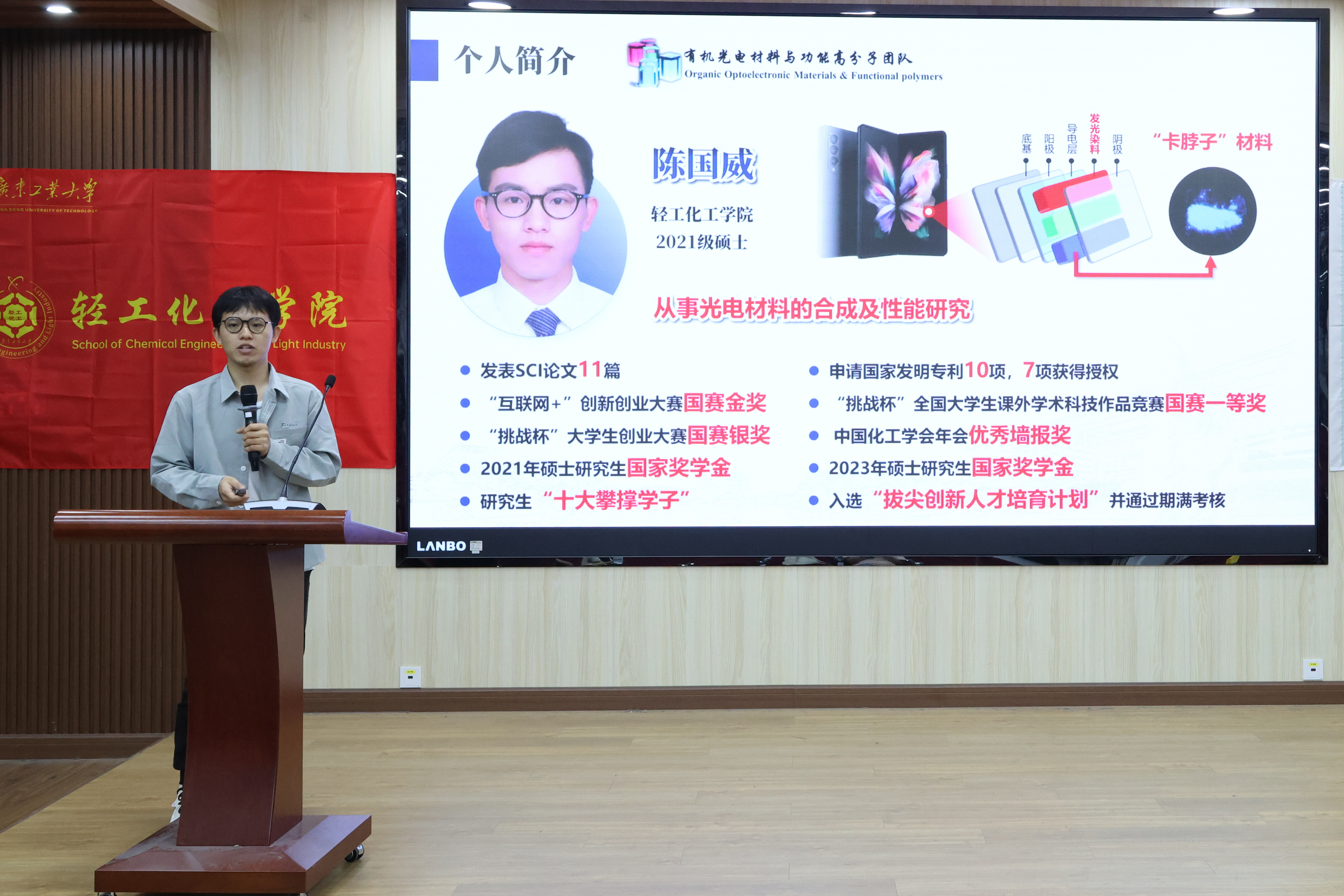 紧接着,研究生“十大攀撑学子”陈国威同学以研究生学习为出发点,分享了他在研究生阶段的学术研究和个人成长经历,展示了他11篇SCI论文、10项国家发明专利的科研成果以及背后的奋斗历程,强调科研创新的重要性,鼓励同学们要保持对科研的热情,切勿急躁。同时作为团队负责人,他分享了自己在团队合作、时间管理等方面的心得体会,给在场的同学们提供宝贵经验。