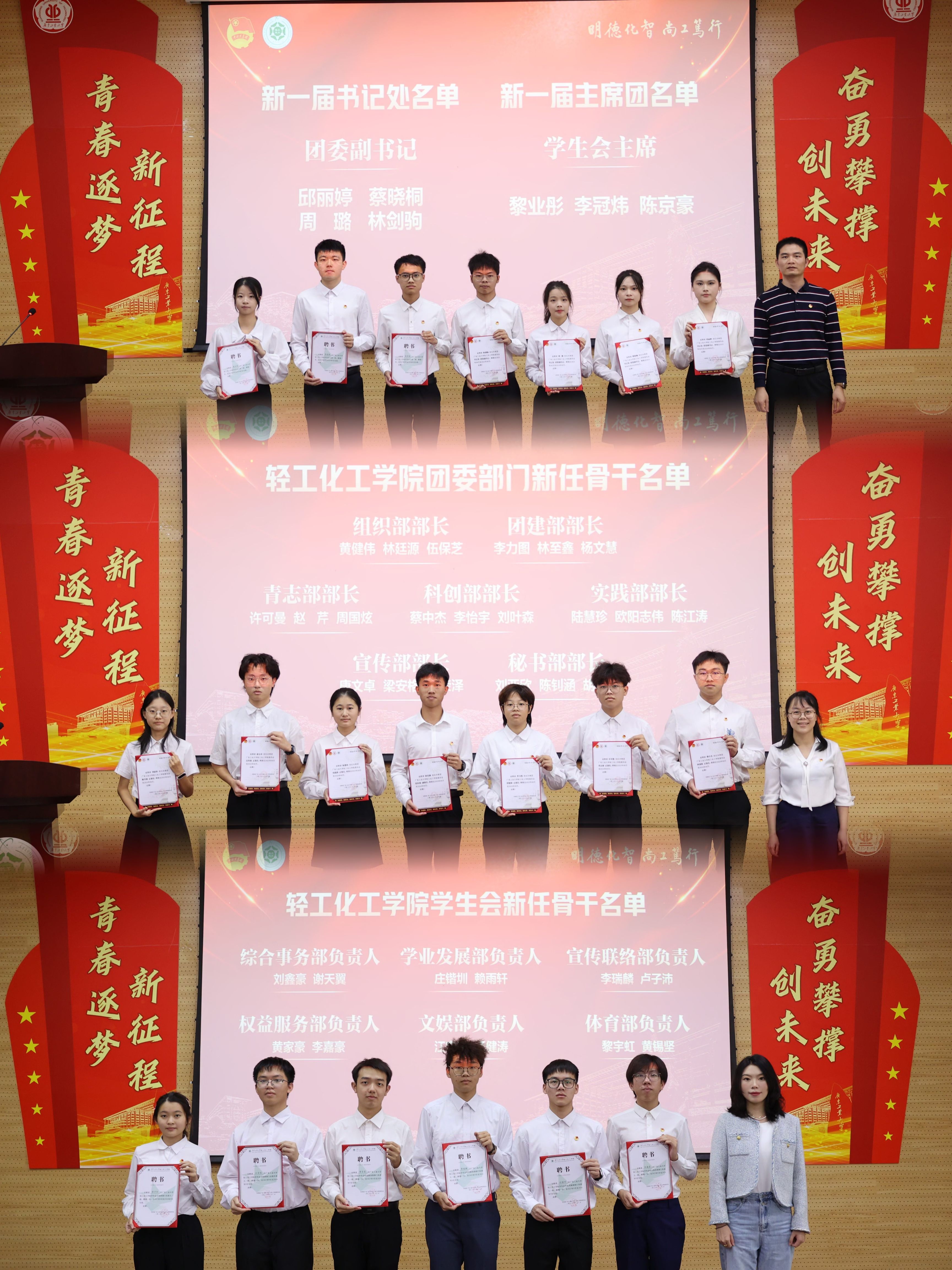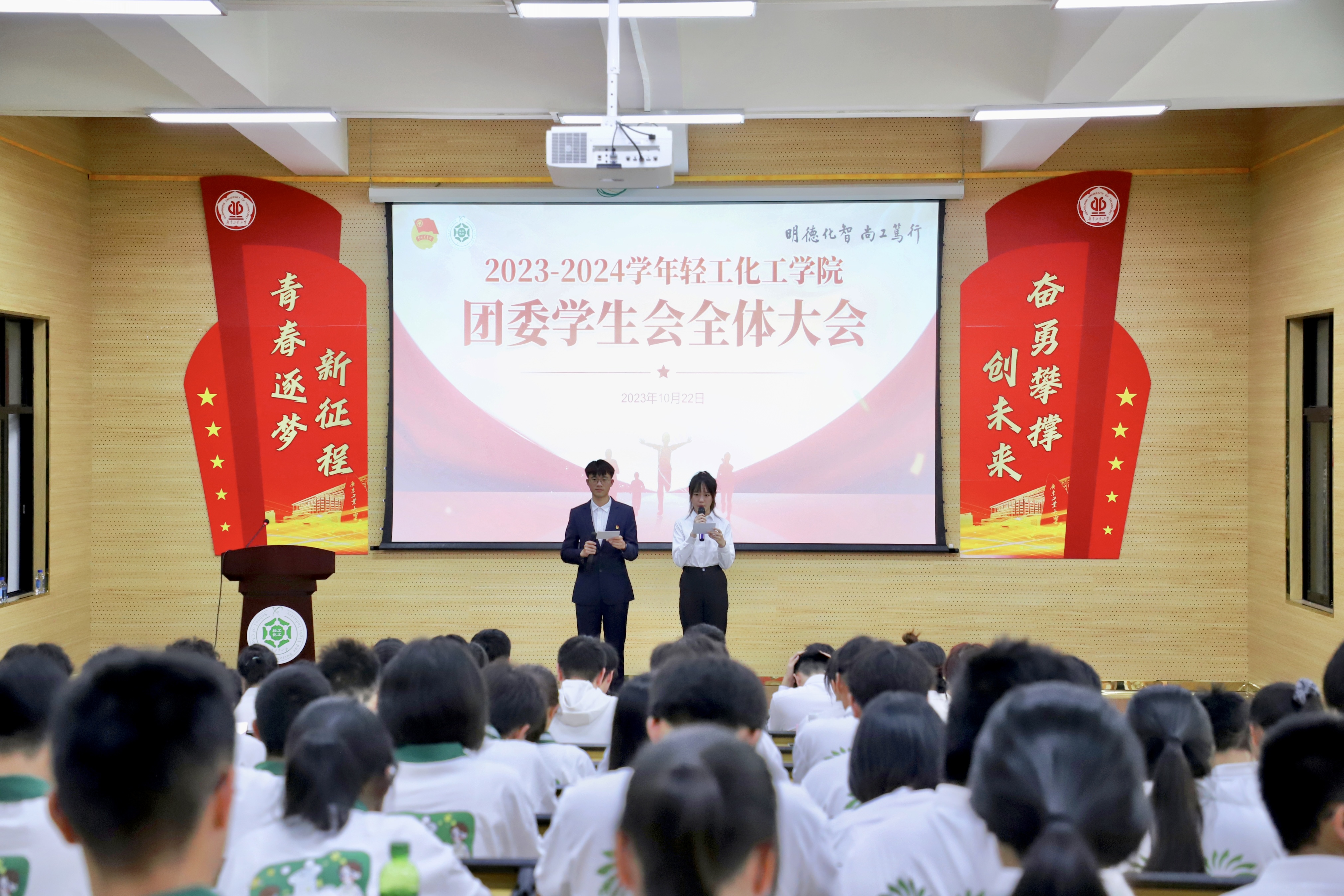 本科办学65周年校庆,2023年10月22日下午,我院团委学生会在科技南楼学术报告厅召开2023-2024学年轻工化工学院团委学生会全体大会。学院党委副书记杨刚、团委书记李韵捷、学生会秘书长徐丹宁、学院辅导员,兄弟学院团学组织学生骨干代表,以及学院团委、学生会全体成员出席会议。会议由团学骨干黄健伟、赖雨轩主持。