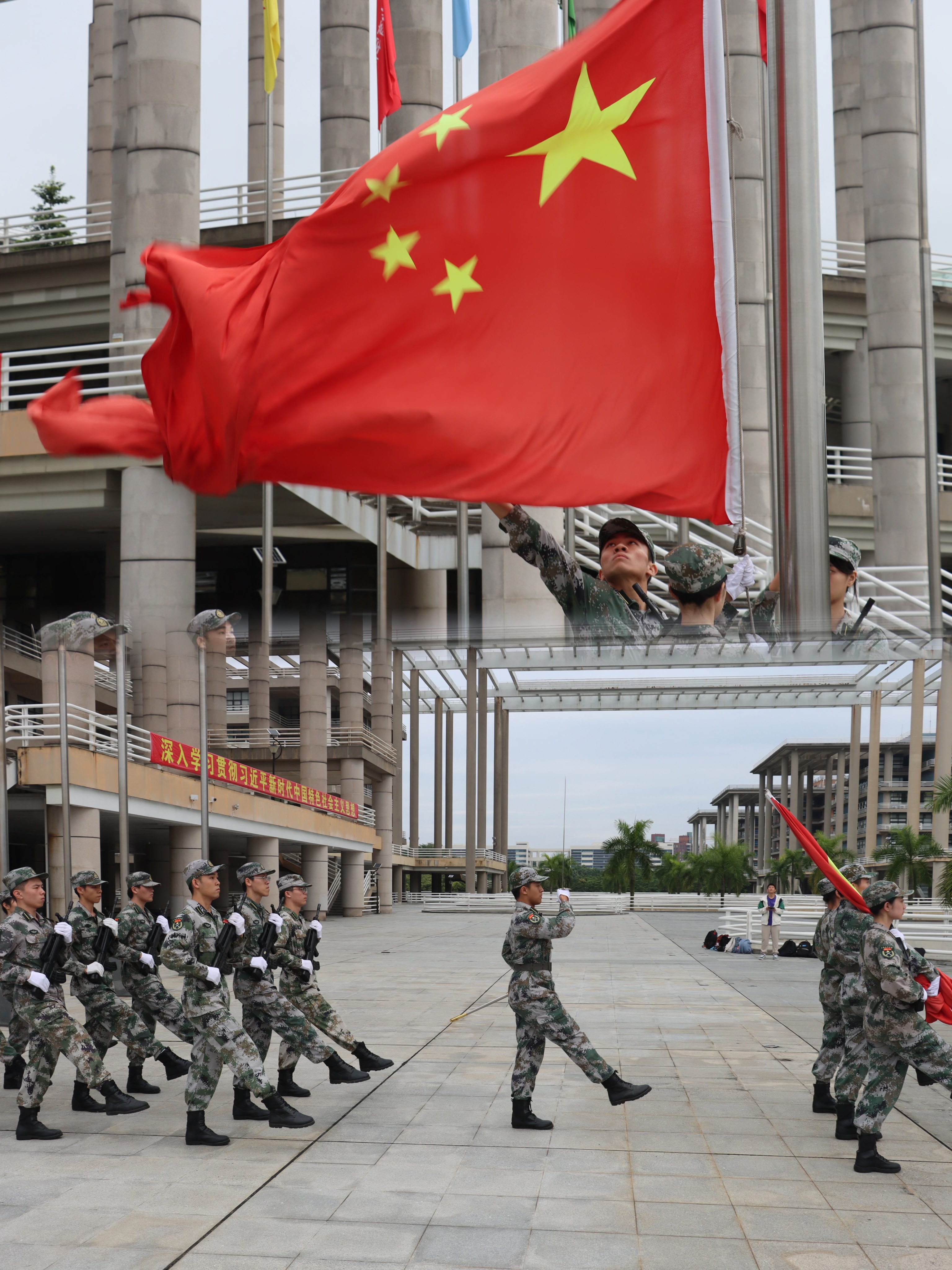 迎着初升的朝阳,国旗护卫队步伐整齐、英姿飒爽,鲜艳的五星红旗冉冉升起,全体师生庄严肃穆行注目礼,高唱国歌,向祖国致以最崇高的敬意。
