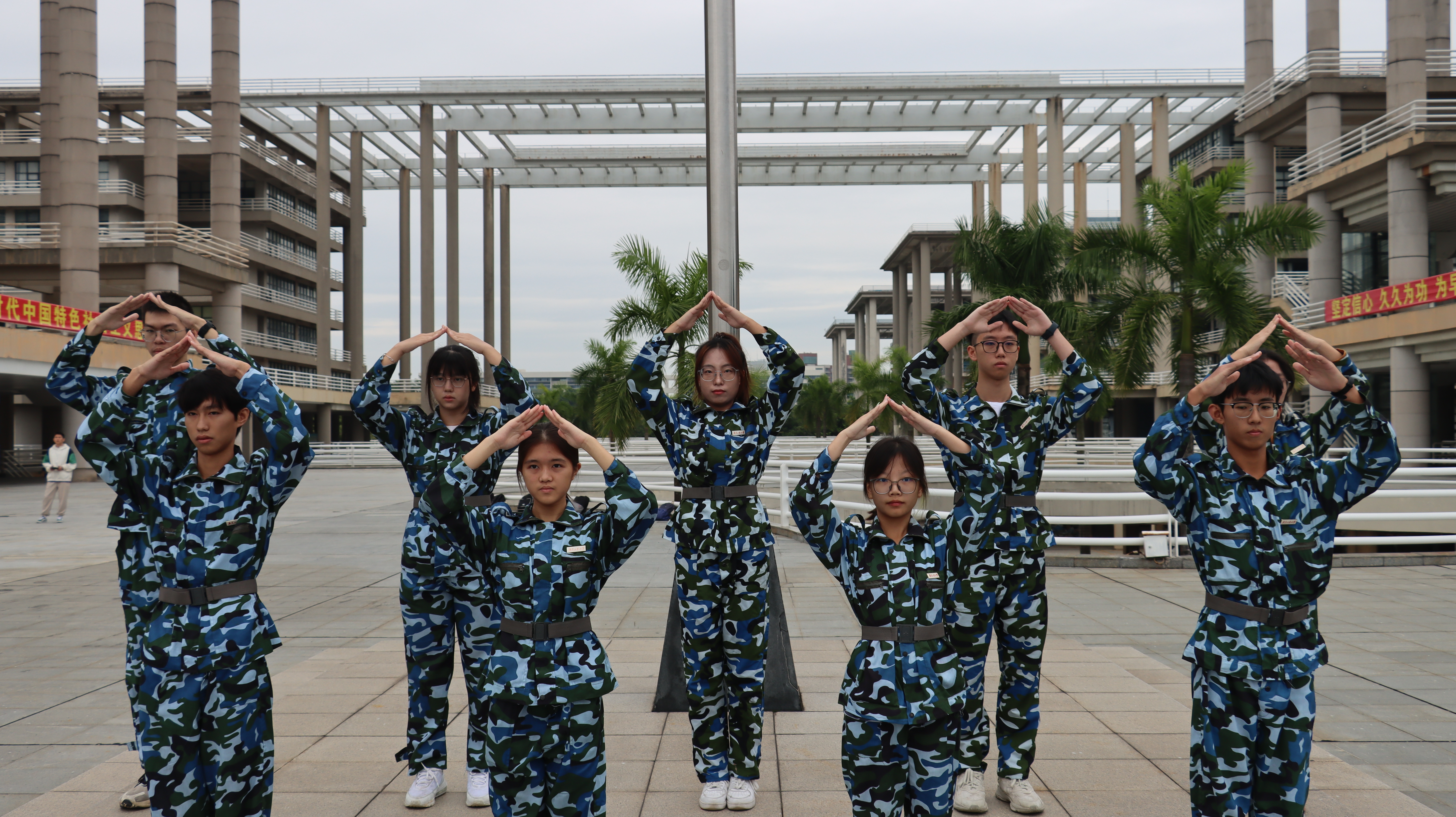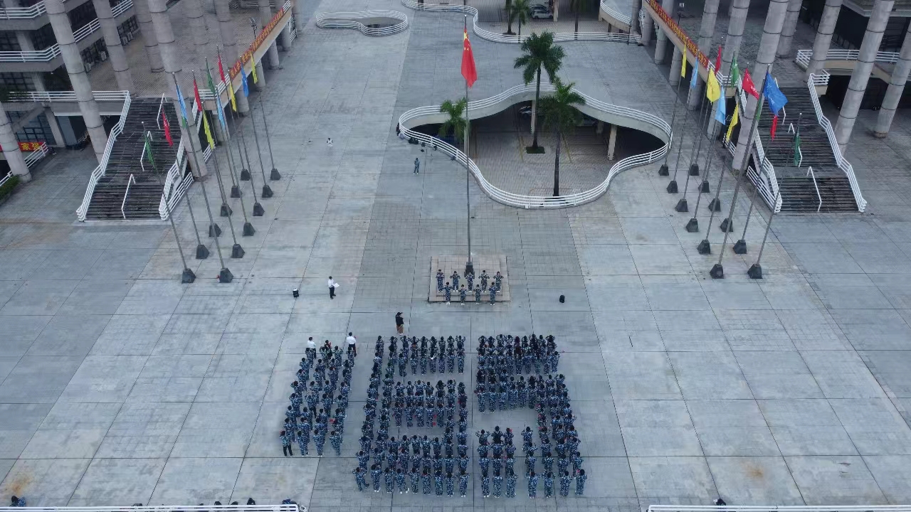 在场全体师生在九名同学的带领下,表演手势舞《国家》,伴随着深情动人的旋律,大家动作感情真挚,舞蹈动作整齐优美,尽情抒发对党和国家的热爱之情。在鲜艳的五星红旗下,同学们摆出“65”阵型,表达了对学校本科办学65周年的衷心祝福,也体现了同学们将接过先辈们的接力棒,夯实个人知识基础,提高自身综合素质,与广东崛起共成长,为广东发展作贡献。