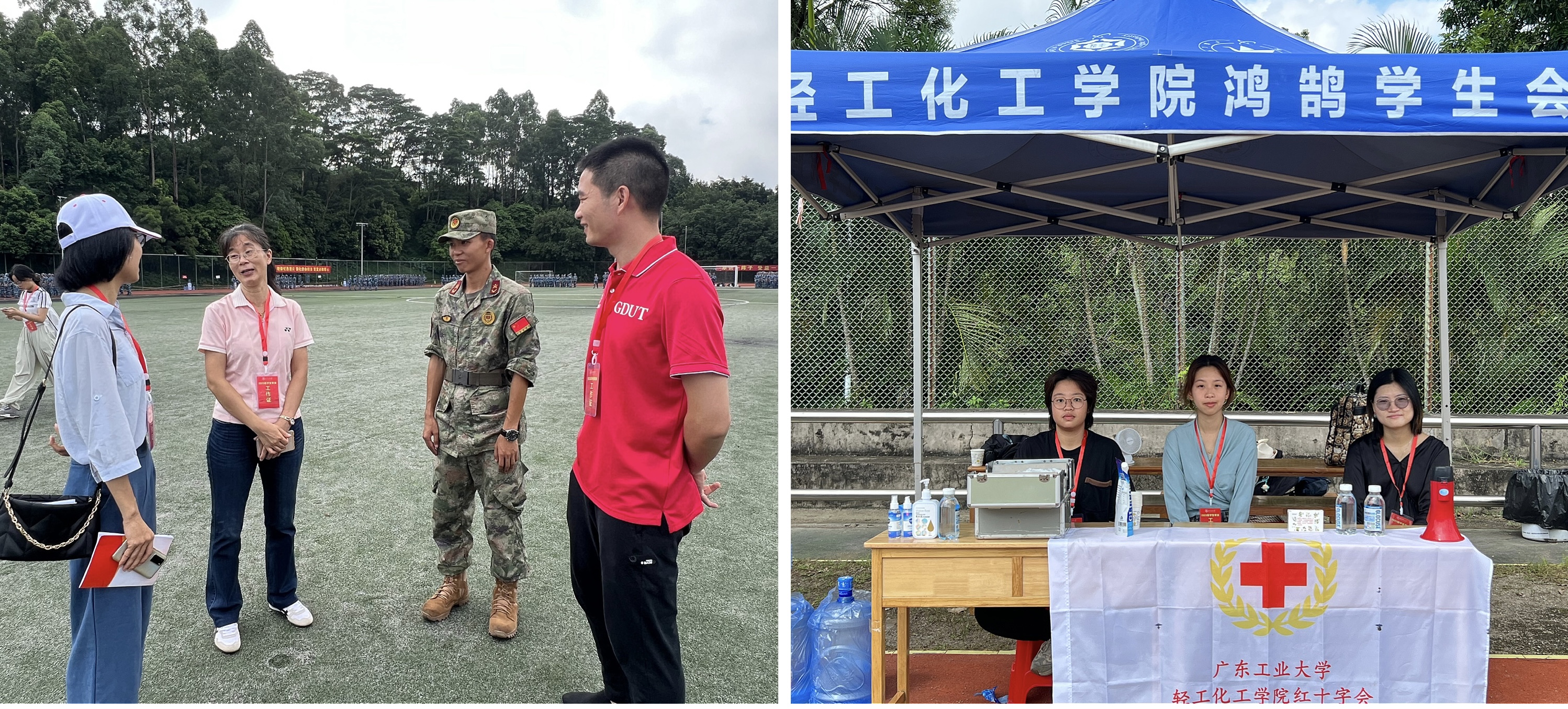 在训练场旁设置后勤补给站,并安排学院红十字会学生干部驻点值班,提供医疗服务,守护轻化新生的身体健康。同时后勤补给站还安排了新生班主任老师与新生学长负责值班,维护补给站的秩序,做好军训期间的后勤保障与宣传工作。