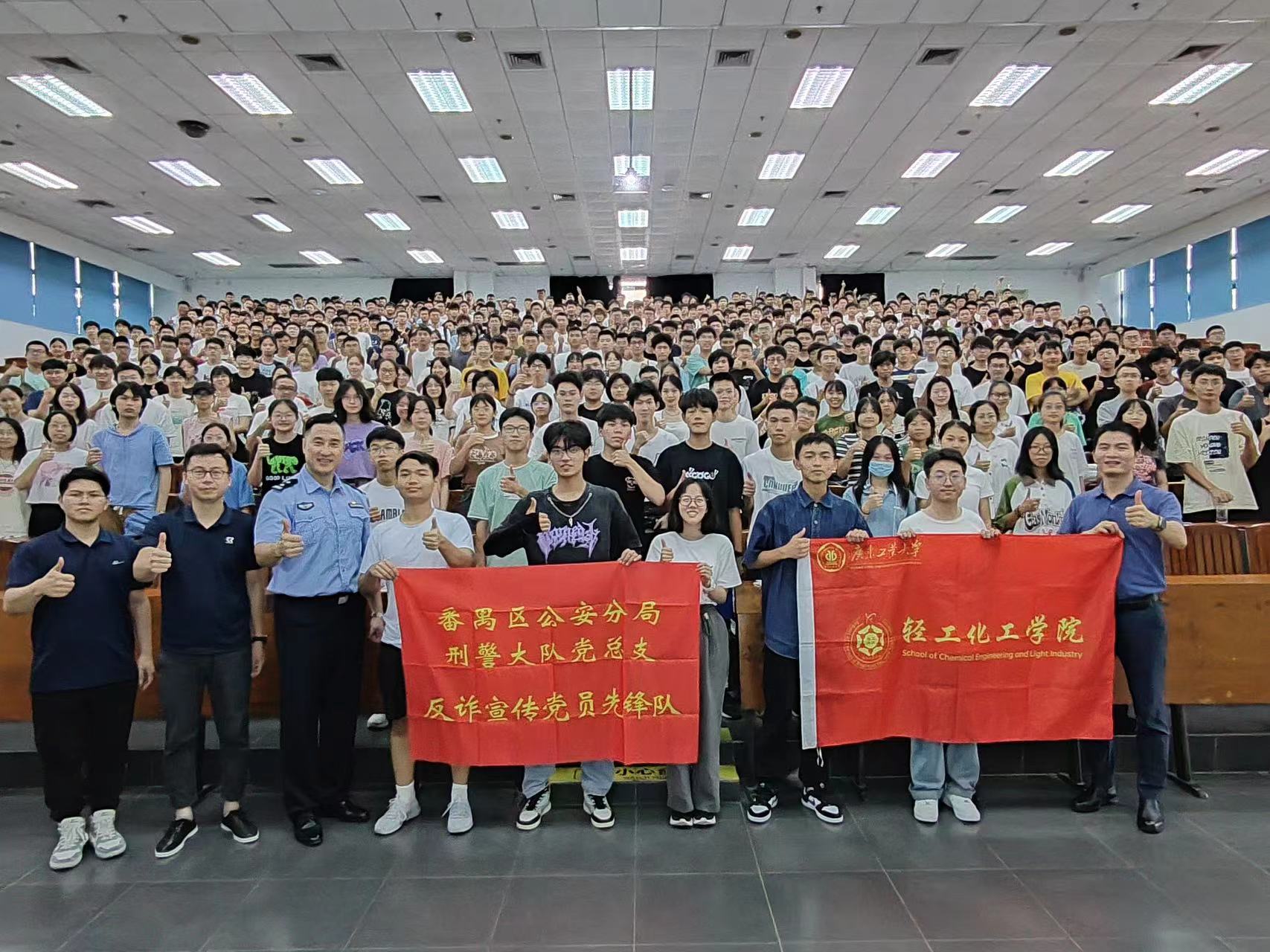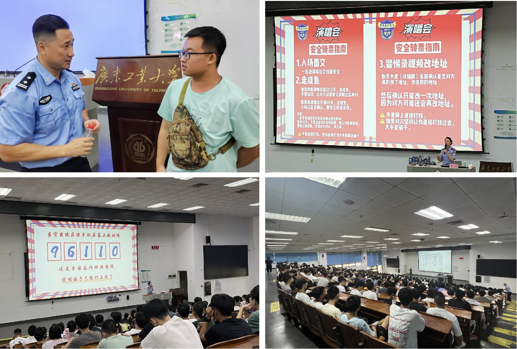 于9月4日开展2023级新生防范电信网络诈骗主题安全教育大会。本次大会邀请番禺公安分局反诈中心王鑫警官、庞彦警官开展防诈骗专题讲座,学院党委副书记杨刚、学校保卫处詹俊宏出席会议。