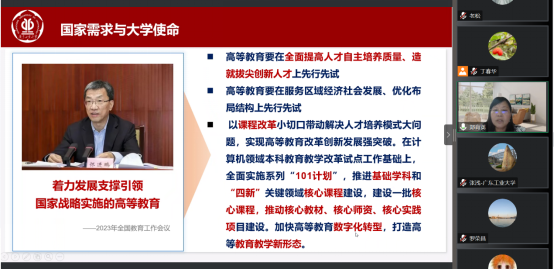 郑育英副院长介绍了课程建设为什么做、怎么做、做什么,以推进核心课程建设。同时介绍了一流课程申报的现状,以及在课程方面取得的成绩和面临的问题,并分享了一流课程申报经验和兄弟院校的优秀案例,为本专业课程建设提供了具体、详实、可操作性强的指导。