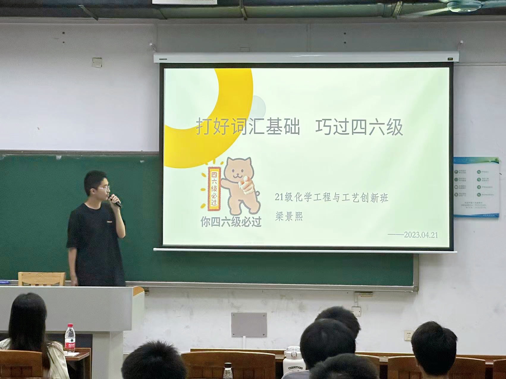 学生工作助理委员会于4月21日在教二220举办“四六一点通,提高倍轻松”英语四六级经验分享会。学院学生工作助理委员会指导老师林沛,2019级化学工程与工艺创新班周法戎、2020级能源化学工程1班钟利君、2021级化学工程与工艺创新班梁景熙及50余名本科生参加了此次活动。