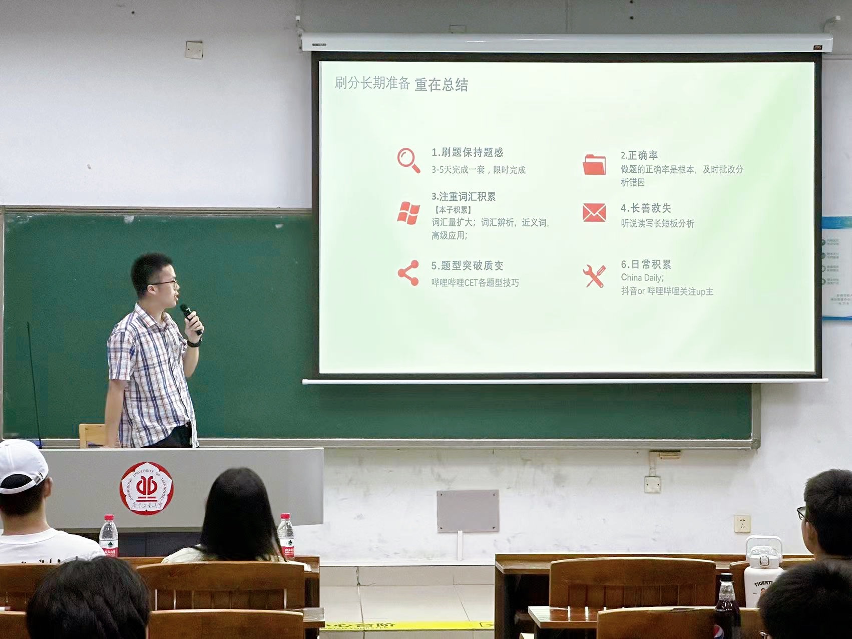 钟利君同学从考试赋分机制、题型分析、应试技巧等方面进行分享,重点讲解了英语四六级考试的题型重点和易得分失分点,并建议同学们在日常学习中要注重词汇积累,定期刷题保持做题手感,并及时分析错题原因,进行定期总结。