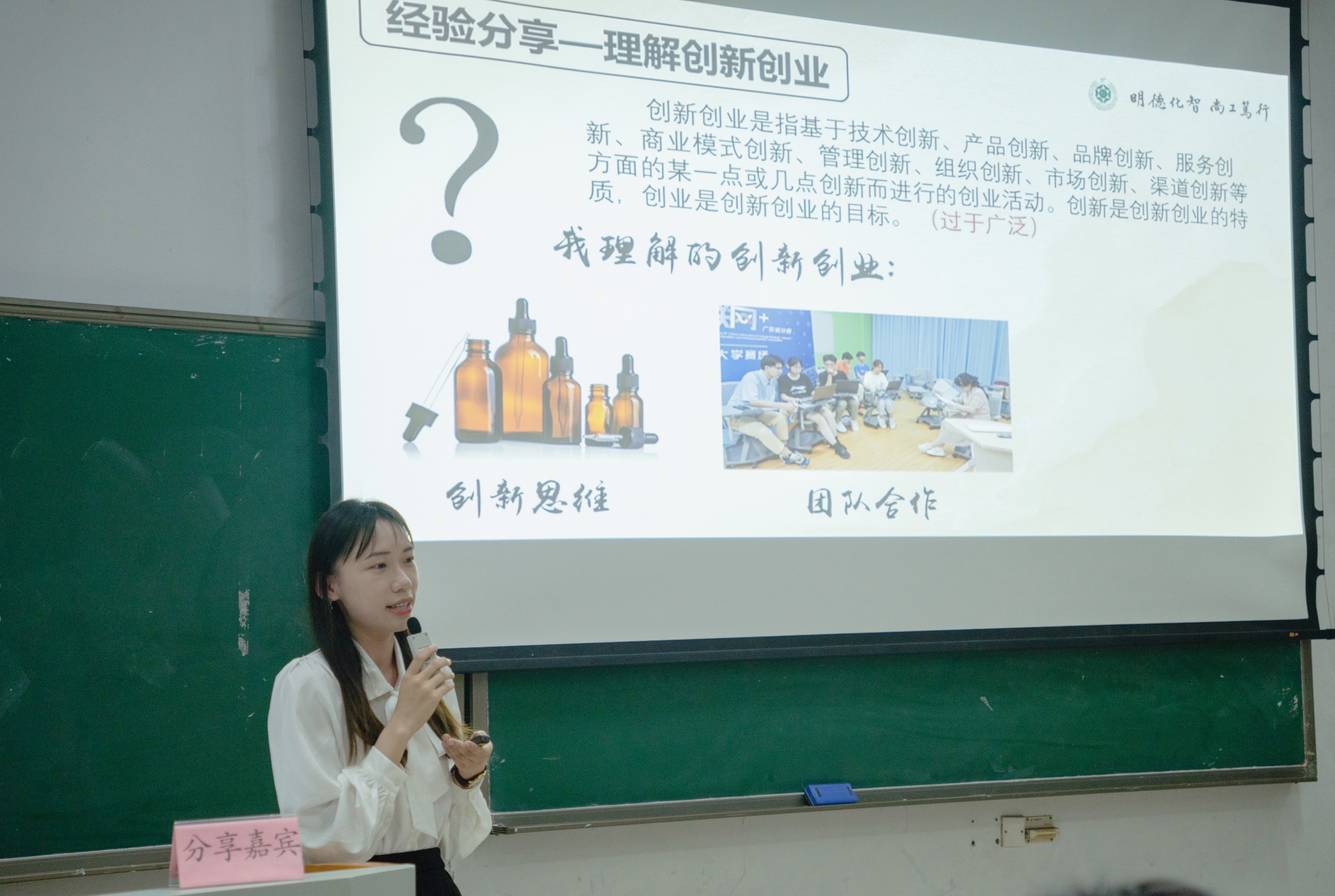 全梓婷同学首先向同学们抛出“你认为什么是创新创业?”这一问题,通过互动交流引导同学们思考创新创业的内涵及意义,并结合自身经验向同学分享了加入创新创业团队的途径以及平衡学习与参与竞赛时间的方法。她指出,要保持对信息获取的敏锐度,积极发挥主观能动性,通过他人推荐、加入实验室、专业群及询问专业老师等方式了解招募信息,获取加入创新创业团队的途径;并建议同学们从以下三点平衡好学习与参加创新创业比赛的时间关系:一要按截止时间、重要程度排序罗列任务清单,二要提高效率,尽量在任务下发的第一时间完成;三要规划好完成各任务的时间,必要时需要牺牲娱乐时间。