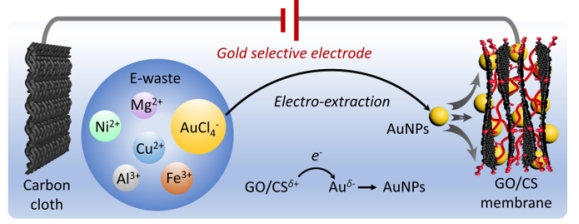 在上述研究的基础上,第二个研究成果以《Two-dimensional electrodes from functionalized graphene for rapid electrochemical gold extraction and reduction from electronic waste》为题发表于《Advanced Science》这一国际顶级学术期刊。这篇论文探讨了氧化石墨烯/壳聚糖新型复合材料作为金回收电极的重要发现(图2),杨蔻副教授担任第一作者,拷贝漫画