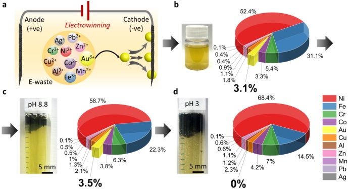 在PNAS发表的研究工作中(如图1),研究团队开发了一种纳米级的复合材料,由二维氧化石墨烯和一维壳聚糖大分子自组装而成,可以同时作为金离子的捕集剂和还原剂。这种创新材料能够从电子废物中同时回收和还原Au³⁺和Au⁺离子,生成固态Au⁰。更为重要的是,这个过程不需要施加任何电压,仅依赖于金离子在氧化石墨烯/壳聚糖纳米空间中的化学吸附动力学及其在多个结合位点上的化学还原。这种离子吸附中的协同效应使得金的提取效率极高。其提取能力对于Au³⁺达到16.8 g/g,对于Au⁺达到6.2 g/g,这都是现有任何金吸附剂的十倍以上。提取效率超过99.5 wt.%(目前的极限为75 wt.%),在低至3 ppm的金浓度下也能实现有效提取。这种金回收的创新研究不仅提高了电子废液中金属的回收效率和可持续性,也标志着二维复合材料在自然资源保护方面的重大进展。