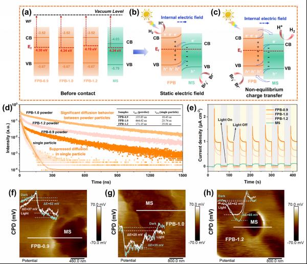 通过调控FAPbBr3钙钛矿前驱体化学计量比,构建FAPbBr3/MoS2原子级紧密键合界面,高密度Pb-S键合使电荷分离效率从29%跃升至63%,太阳能到氢能转换效率(STH)达8.6%。研究发现,钙钛矿自身高载流子密度梯度驱动的非平衡内建电场主导电荷转移,而非传统异质结机制。DFT理论模拟显示饱和配位界面优化了电子传输路径,富铅表面为原子级接触提供更多活性位点。优化后的异质结光催化产氢效率达院士FAPbBr3的98倍,瞬态吸收光谱证实电荷分离时间从489 ps缩短至112 ps,分离效率提升2.2倍。