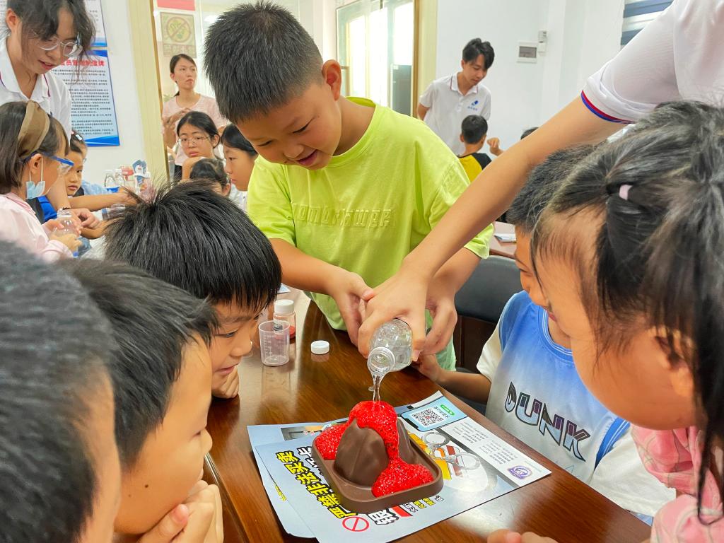 实践队成员化身魔术师,带领孩子们走进了一个充满奇迹的化学世界。从“火山爆发”的壮观景象到手摇发电机的神奇运作,每一个实验都让孩子们目不暇接,惊叹连连。他们亲手操作,踊跃提问,从实验中领悟化学的奥秘,实践队在互动实验中引导孩子们思考背后的科学原理,培养了他们对科学的浓厚兴趣和创新思维。