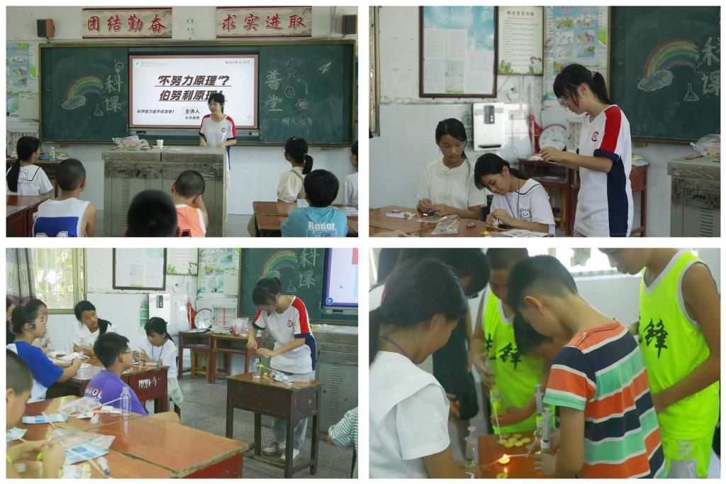 为推动县域地区的科普教育,团队在永兴县先锋小学为留守学生开展了三节科学启蒙“微课堂”。课堂上成员们将科学原理融入生活实例,在公道杯原理的讲解中,团队巧妙地将物理原理与中华文化相结合,让孩子们领略到科学的魅力与中华优秀传统文化的深度。除此之外,团队带领孩子们利用生活中常见的材料亲手制作简易吸尘器与灭火器。团队成员凭借扎实的专业基础和丰富的知识储备,通过各项实验充分展现了化学化工领域的魅力。亲身实践的实验更让孩子们兴奋不已,激发了孩子们对科学的热情和探索科学的渴望,为他们的未来学习和成长奠定了坚实的基础。