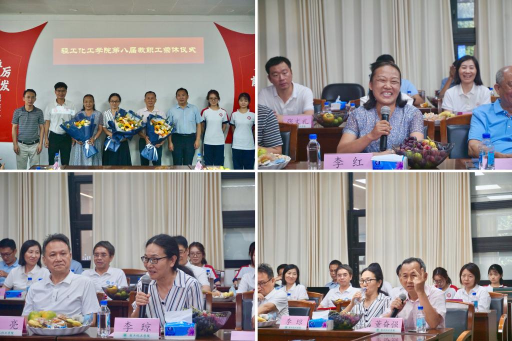 随后,学院举行了第八届教职工荣休仪式。过去一年,学院有五位教职工光荣退休。余林副校长、周东斌书记和侯水标校友为荣休老师们赠送鲜花和纪念品。荣休教师代表李红、李琼和董奋强三位老师对学院的关心、关怀表示感激,与大家一同回顾了他们与轻化学院同奋斗、共成长的历程。作为老轻化人,他们表示会继续关心关注学院的发展,为学院在人才培养、科学研究、青年教师成长等方面积极建言献策,同时也对学院的未来发展充满无限期许!