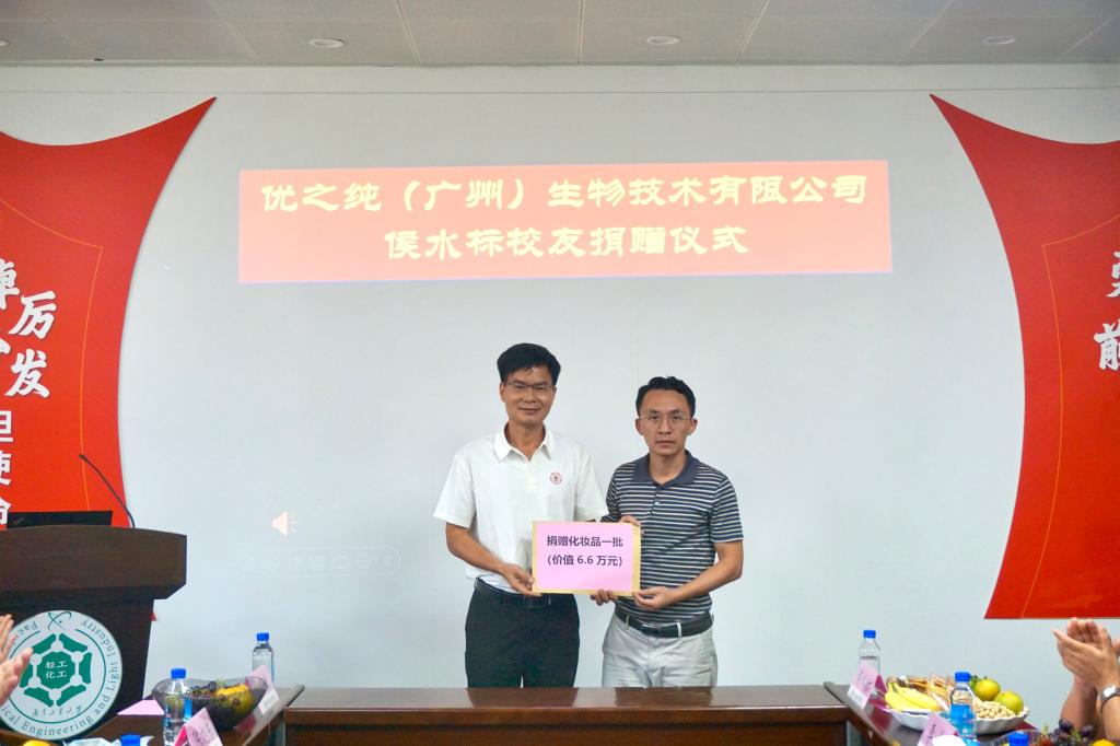 2008届校友、优之纯(广州)生物技术有限公司创始人侯水标先生向学院每位老师赠送了一套精美护肤品作为教师节礼物,以表达对学院和老师的祝福和感恩。周东斌书记代表学院接受捐赠。