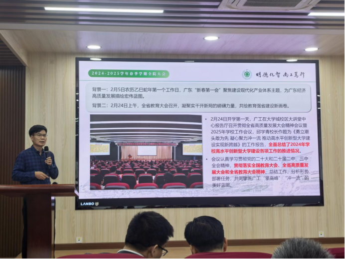 学院党委书记周东斌介绍了新入职教师,传达了学校贯彻全省高质量发展大会精神会议暨2025年学校工作会议精神,强调全体教职工要积极响应学校“马上干、全力拼、大胆闯”的号召,认真学习领会,自觉贯彻落实。他详细解读了2025学校事业发展重点工作“七大任务”,强调学院要以“冲一流”建设为目标牵引,牢牢把握发展机遇,全体教职工要深刻领会学校的发展战略,将自身工作与学校整体规划紧密结合,以创新为引领,以质量为保障,为学校的高质量发展贡献智慧和力量。